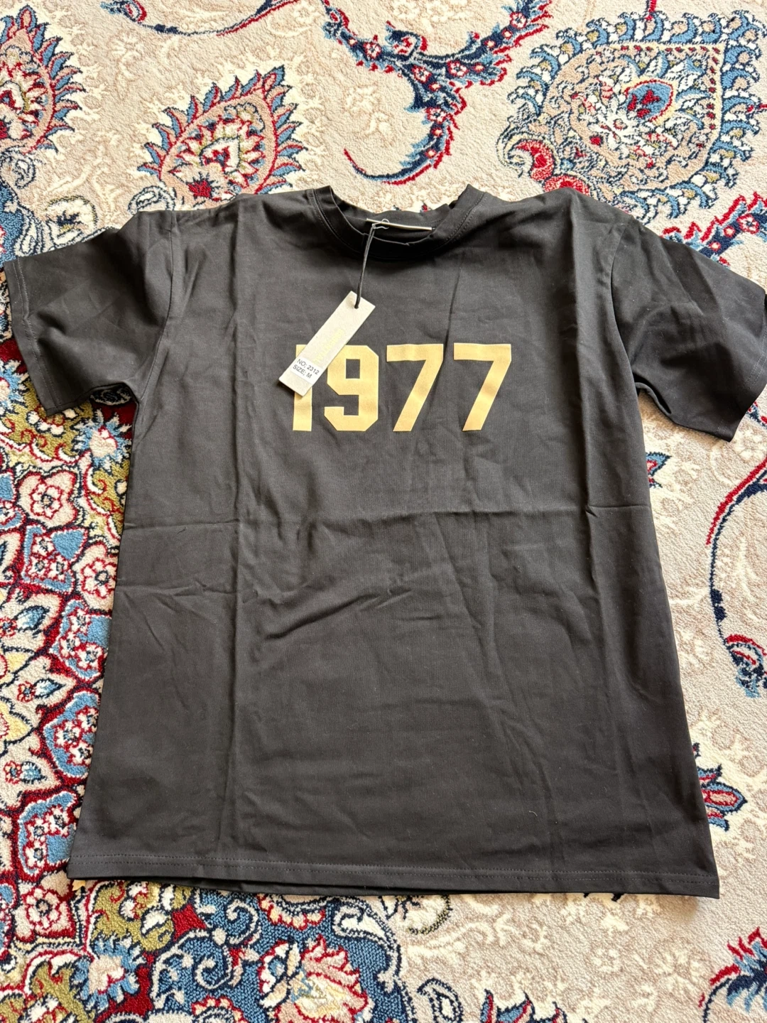 Black t-shirt with "1977" graphic print. Essentials by Fear of God. Made with comfortable fabric. Size medium.
