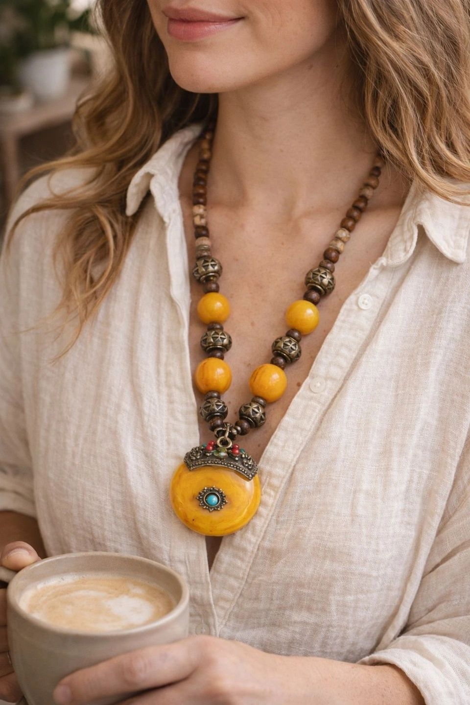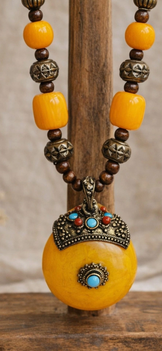 A striking vintage statement necklace featuring a large golden-yellow faux amber resin pendant, accented with ornate brass-tone metalwork and turquoise- and coral-tone cabochon details. This piece embodies classic 1970s bohemian style with ethnic and tribal revival influences. The necklace is composed of hand-strung beads including warm resin elements, carved metal spacers, and natural wood beads, creating a rich, earthy color palette. Finished with an original vintage hook clasp, showing authentic age and patina consistent with a well-loved vintage piece. Era: Vintage, likely 1960s–1970s. Materials: Faux amber resin, brass-tone metal, wood beads, faux turquoise & coral accents. Necklace length: approx. 12–13 inches drop (see photos with tape measure). Pendant size: approx. 2 inches. Closure: Original vintage hook clasp. Good vintage condition with natural patina and age-appropriate wear. A true boho statement piece!