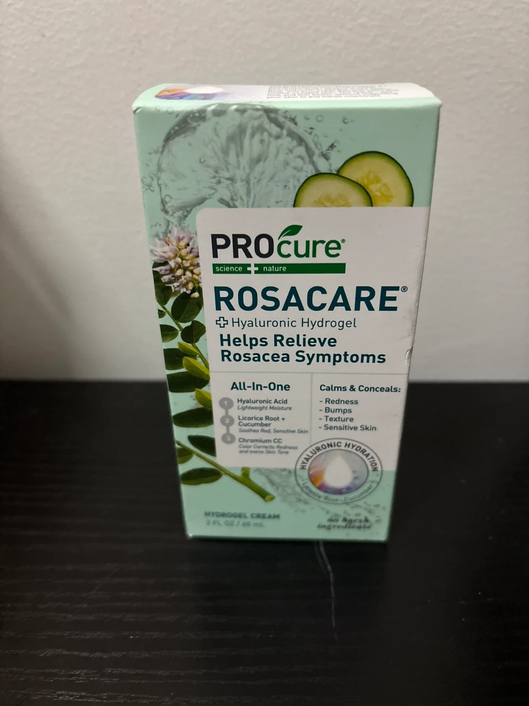 This PROcure ROSACARE Hyaluronic Hydrogel cream helps relieve rosacea symptoms. It's an all-in-one formula with Hyaluronic Acid for lightweight moisture, Licorice Root and Cucumber to soothe redness, and Chromium CC to color correct. The cream calms and conceals redness, bumps, texture, and sensitive skin.