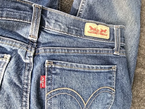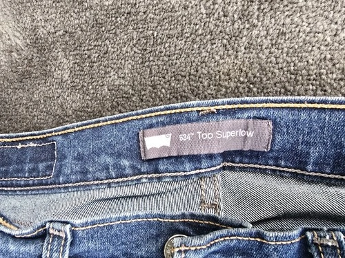 A pair of Levi's 524 Too Superlow women's blue denim jeans in size 27 x 32. These low-rise jeans feature a zip closure, regular fit, straight style, and a 5-pocket design. Made from a cotton blend denim fabric, they are part of Levi's 500 Series product line and are designed to be comfortable and stylish for everyday wear. The Levi's brand is known for its quality and durability.