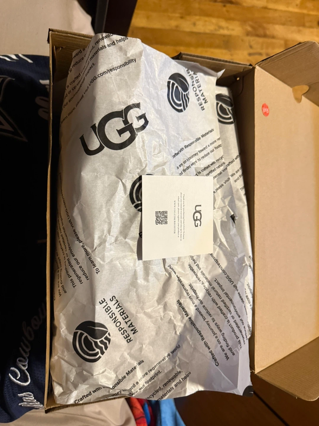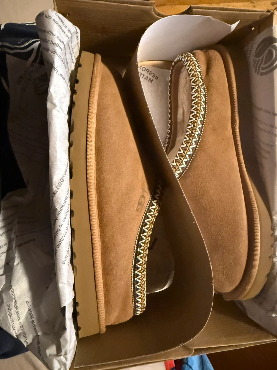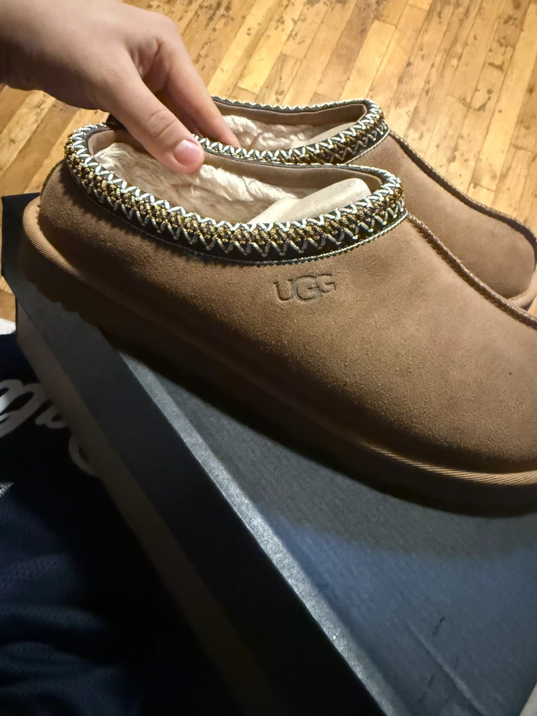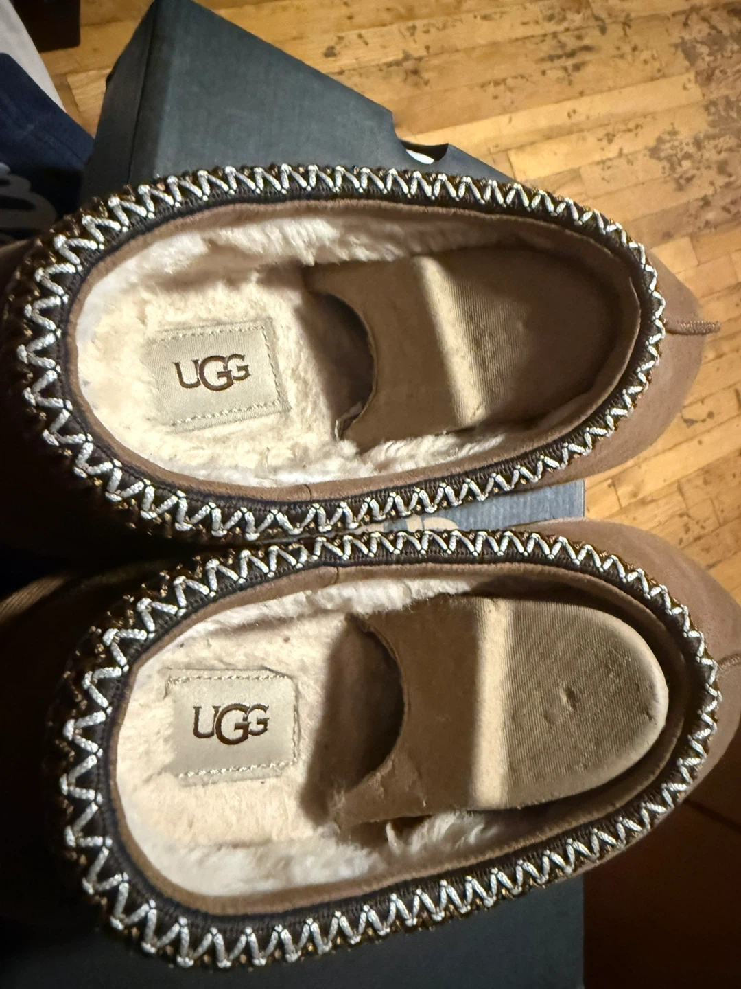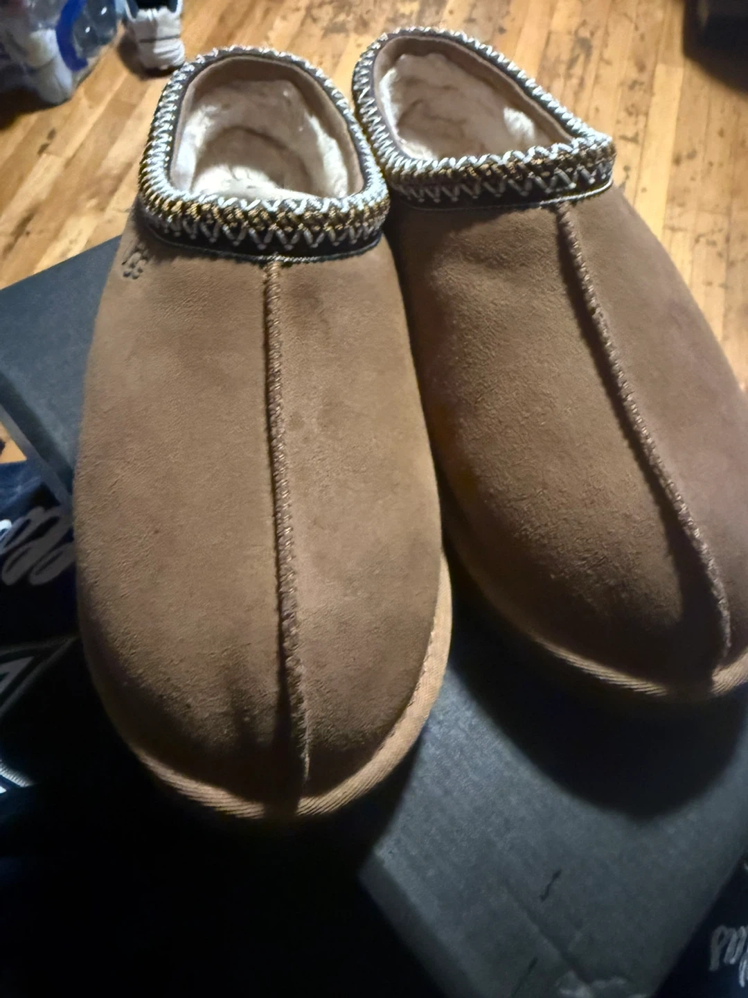 These UGG slippers are made from brown suede. They feature a cozy shearling lining and a decorative braided trim. Includes the original box.