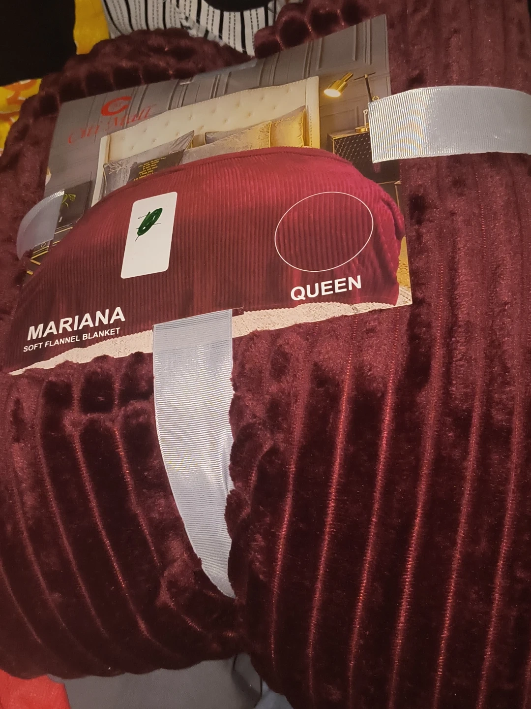 This Mariana soft flannel blanket comes in a queen size. It's made of plush material for extra warmth. Perfect for cozying up on chilly nights!