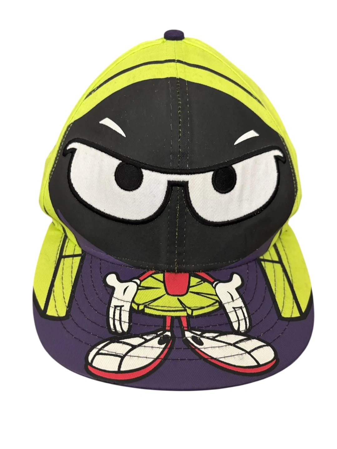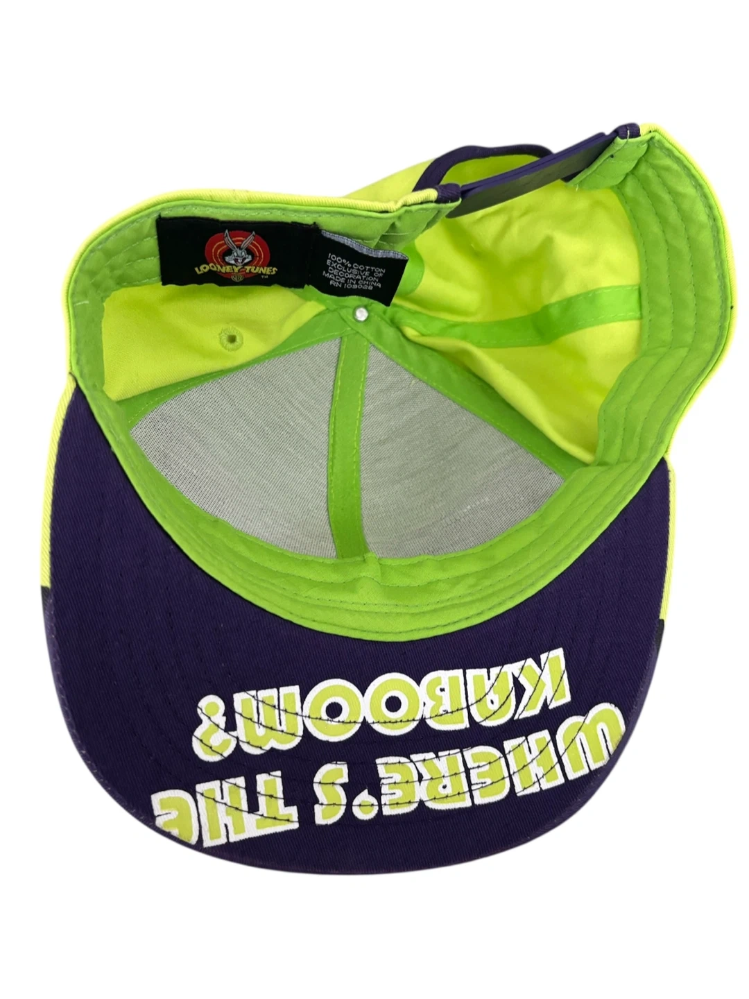 Selling a Looney Tunes baseball cap featuring Marvin the Martian! It has a vibrant neon green and purple color scheme. The inside brim has the text "WHERE'S THE KABOOM?"