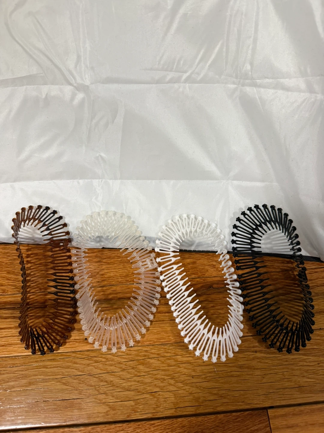 This set includes four flexible hair combs, perfect for styling. It comes with two black combs, one white, and one brown. The combs are made of plastic and have a unique flexible design.