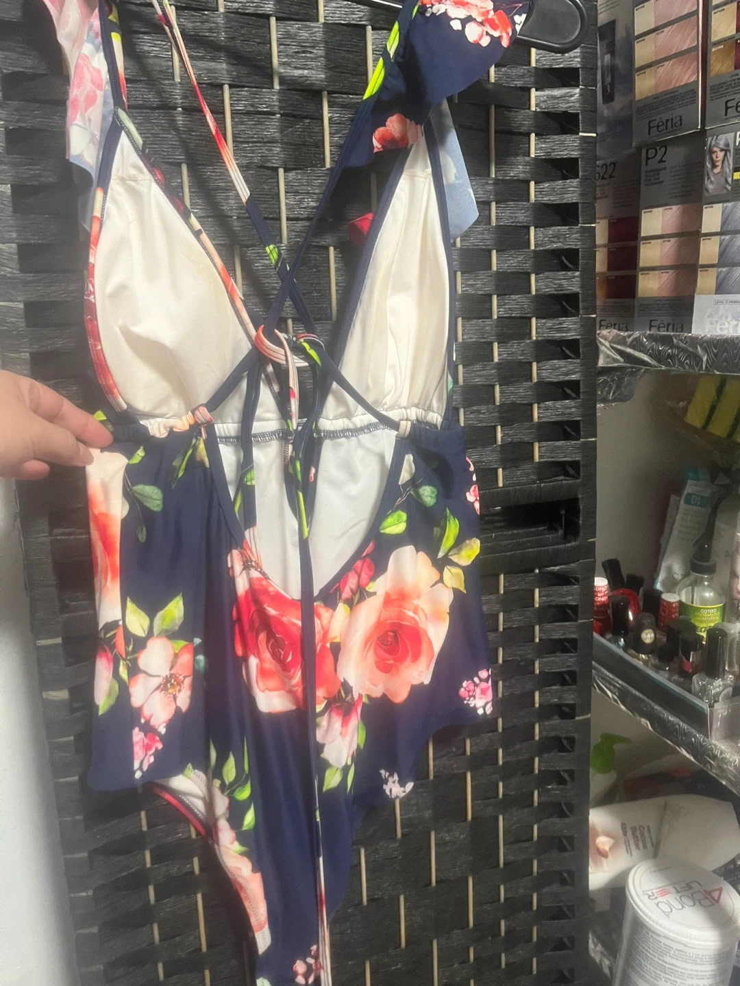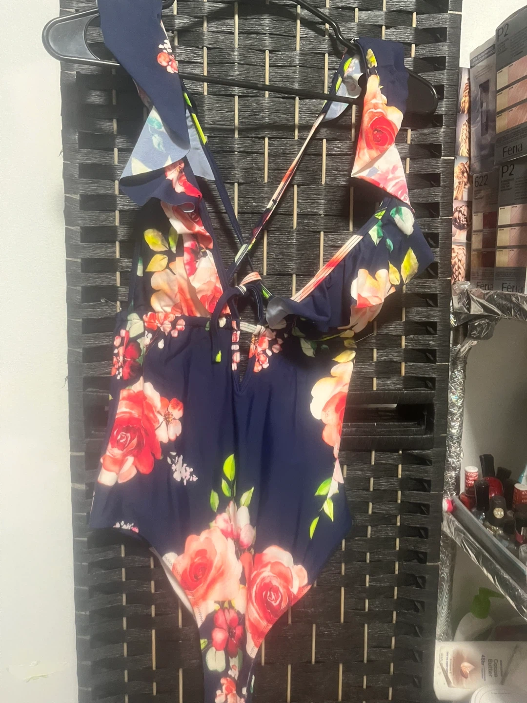 This one-piece swimsuit features a navy blue background with a vibrant floral print. It has a flattering neckline with ruffle details and adjustable criss-cross straps in the back. Perfect for your next beach or pool day!