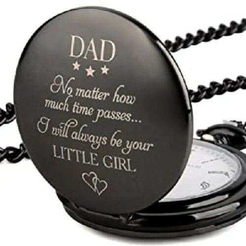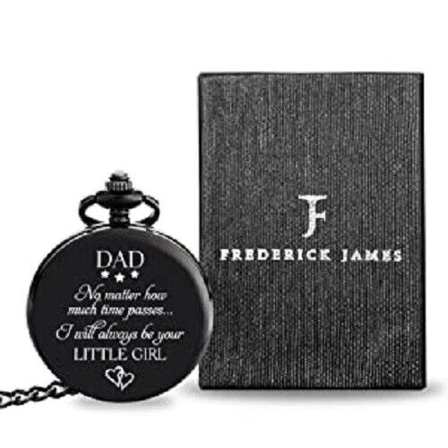 Beautifully engraved pocket watch with the inscription: “Dad, No Matter How Much Times Passes, I Will Always Be Your Little Girl”. A unique and thoughtful gift for Dad from Daughter. Perfect for Father's Day, birthdays, weddings (Father of the Bride), Valentine's, or Christmas. The intricate engraving is artist-designed for a beautiful, sentimental touch. Measures 4.5cm in diameter with a 40cm chain. Superior quality and black in color to make the inscription stand out. This timepiece also has a small space to place a personal photo. Comes in a Frederick James gift box. Elegance, simplicity, and memories.