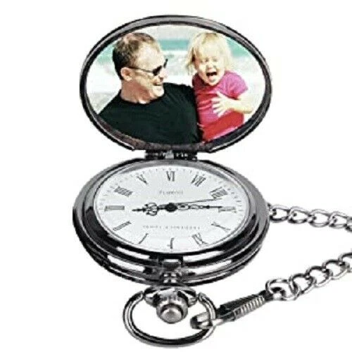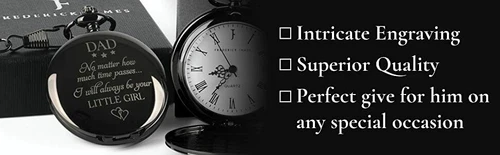 Beautifully engraved pocket watch with the inscription: “Dad, No Matter How Much Times Passes, I Will Always Be Your Little Girl”. A unique and thoughtful gift for Dad from Daughter. Perfect for Father's Day, birthdays, weddings (Father of the Bride), Valentine's, or Christmas. The intricate engraving is artist-designed for a beautiful, sentimental touch. Measures 4.5cm in diameter with a 40cm chain. Superior quality and black in color to make the inscription stand out. This timepiece also has a small space to place a personal photo. Comes in a Frederick James gift box. Elegance, simplicity, and memories.