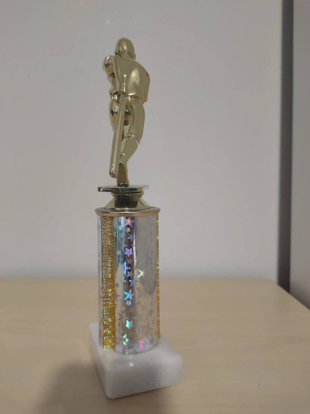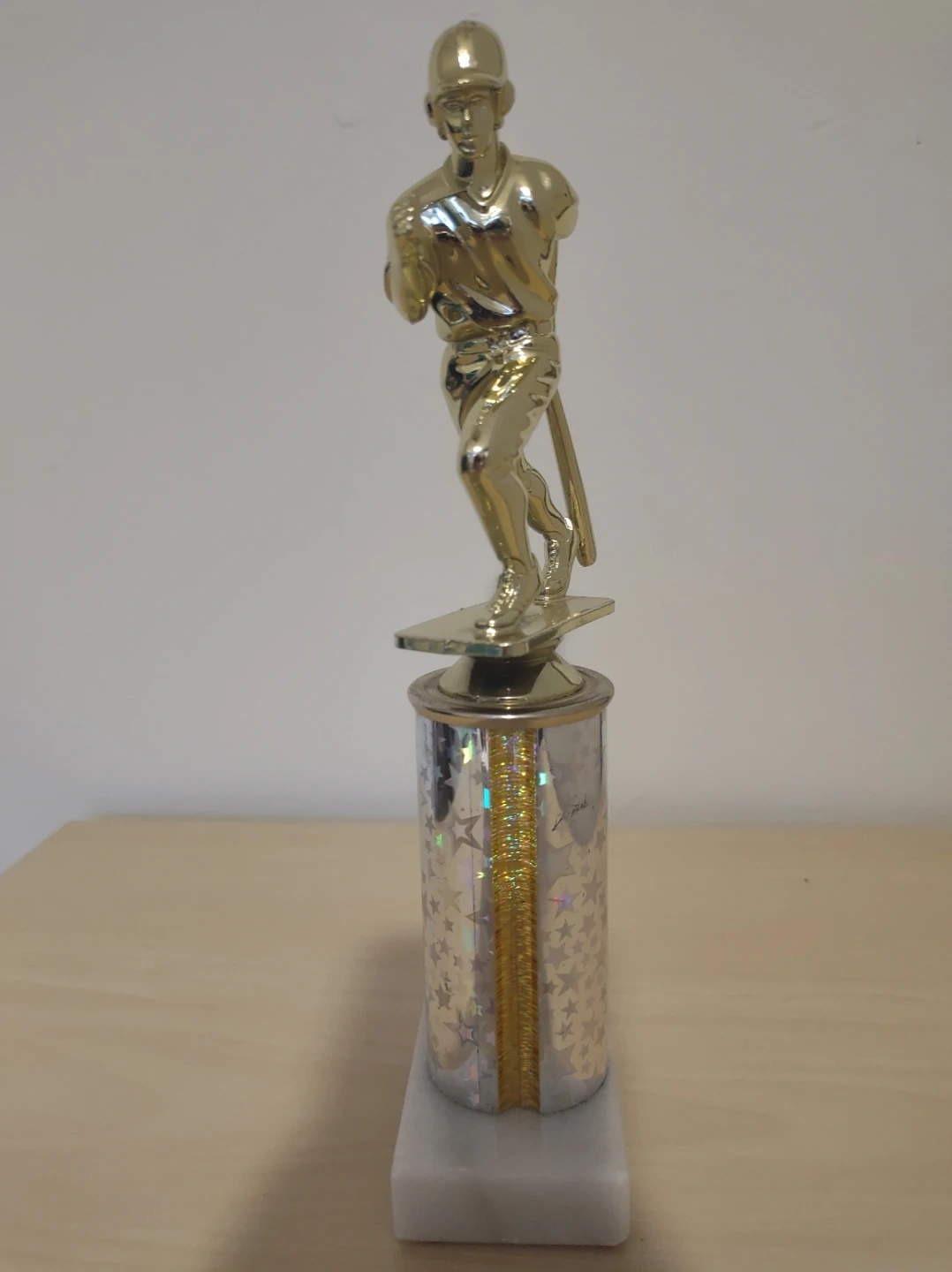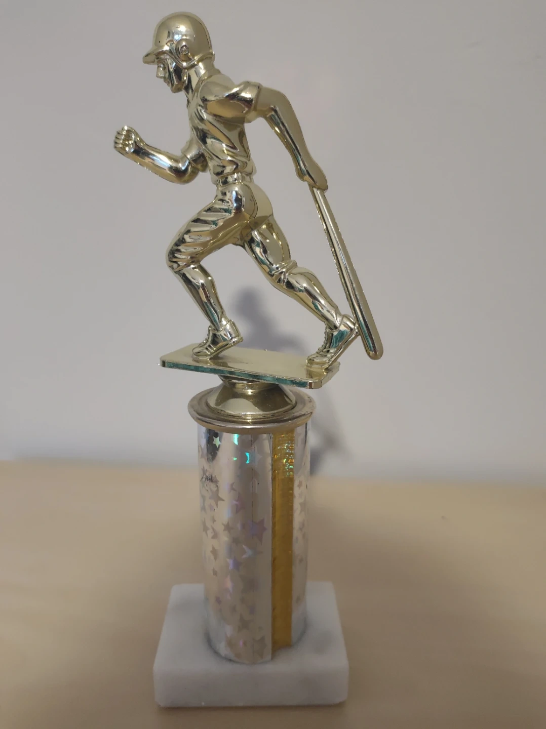 Selling a baseball trophy with a gold-colored player figure on top. The base is decorated with stars. Great for a sports enthusiast or as a fun award!