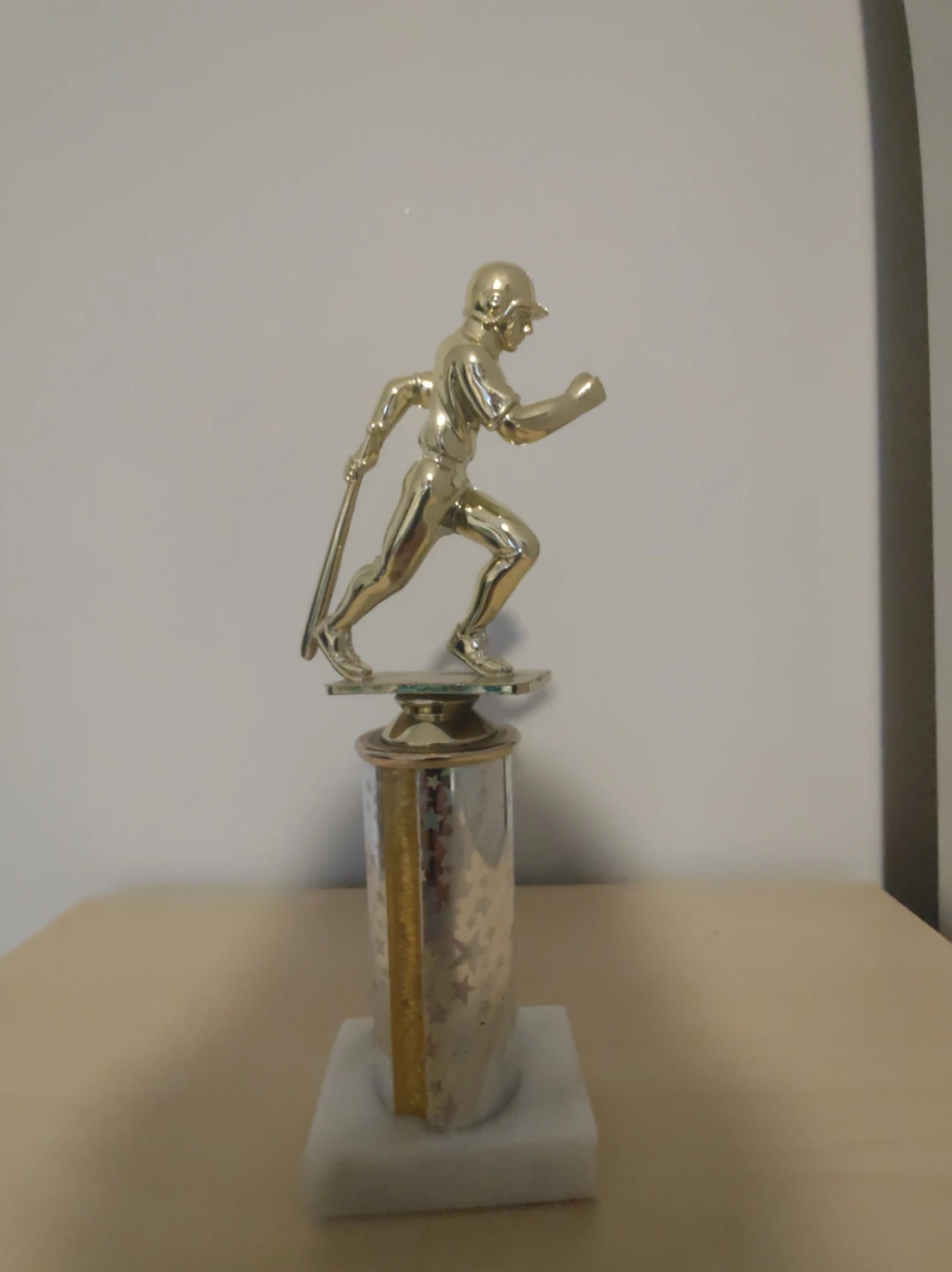 Selling a baseball trophy with a gold-colored player figure on top. The base is decorated with stars. Great for a sports enthusiast or as a fun award!