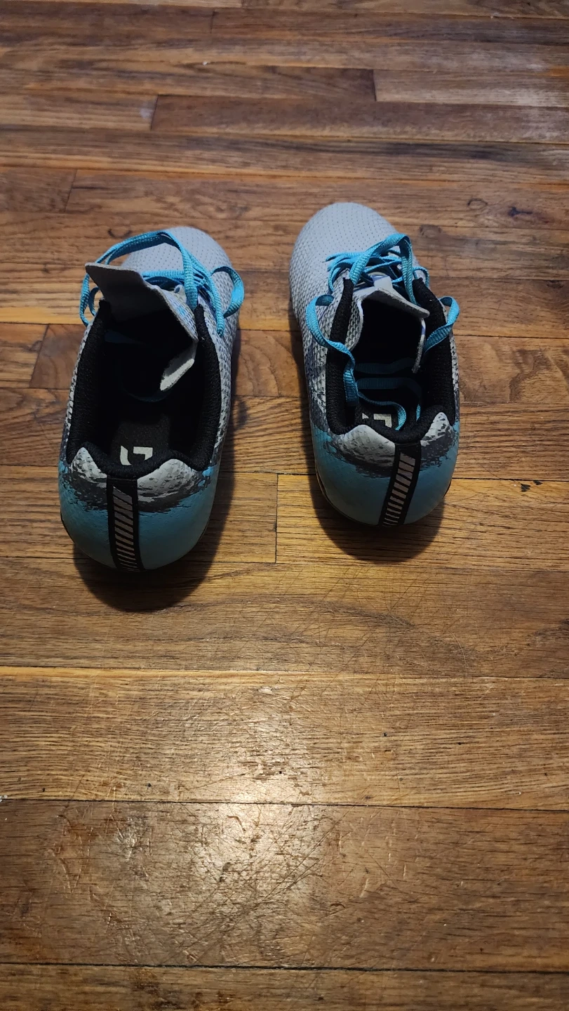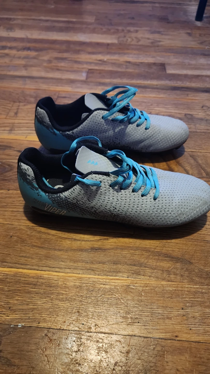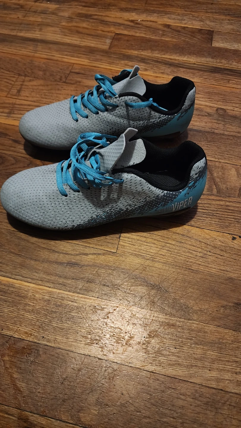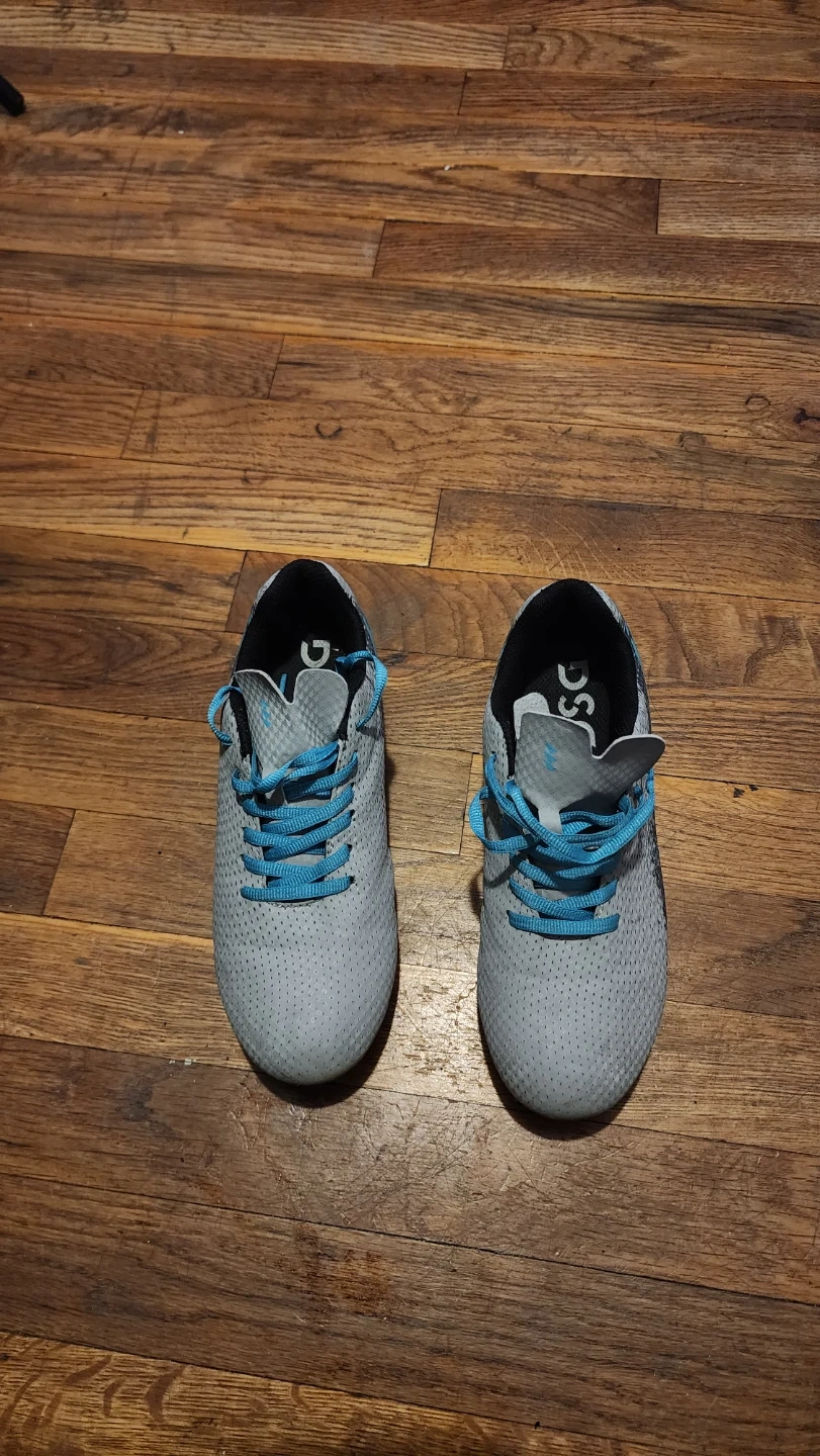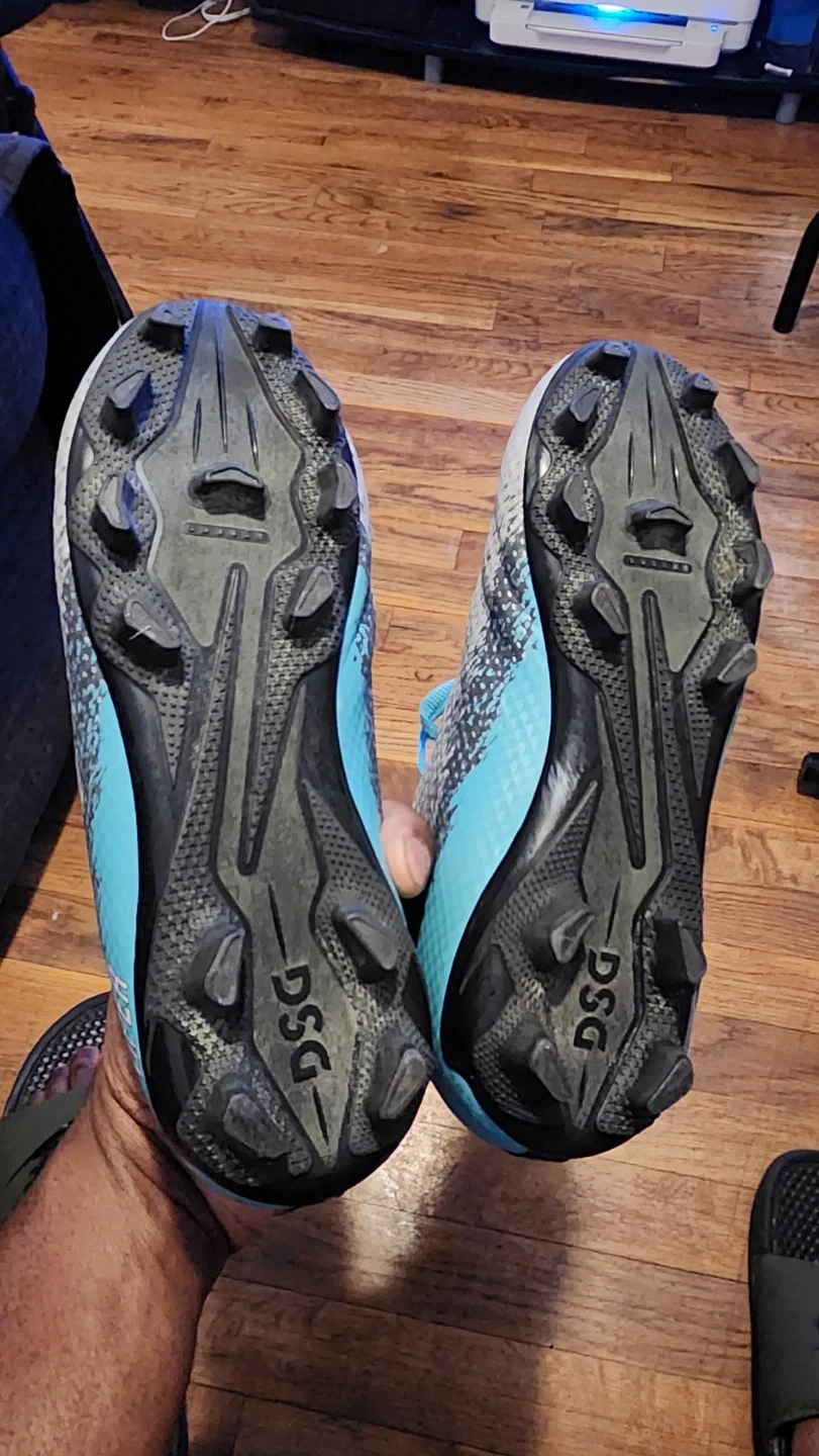These DSG "Storm Viper" cleats are designed for athletic performance. They feature a light blue and grey colorway with vibrant blue laces. The textured sole provides grip on the field and is a size 3.5Y