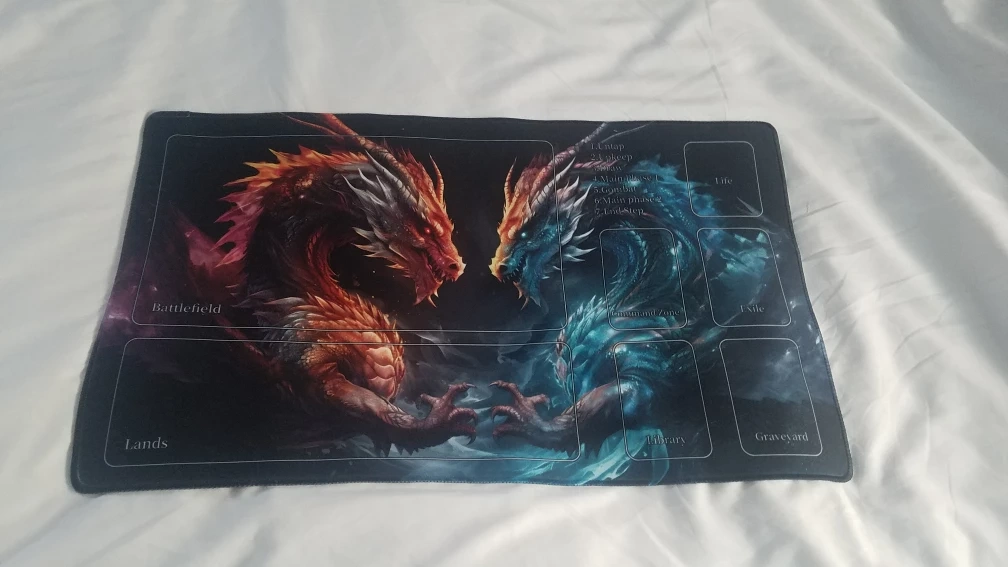 This playmat features a striking design of red and blue dragons facing each other. It's designed for trading card games with designated areas for battlefield, lands, life, graveyard, and library. It's made from a durable, smooth material.