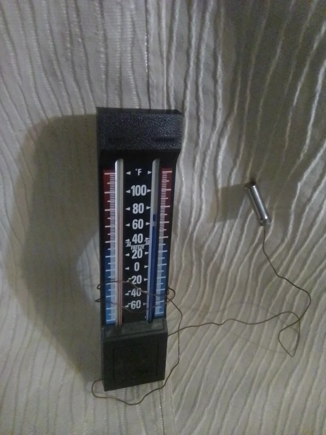 Selling an outdoor thermometer. It measures temperature in Fahrenheit. Great for keeping track of the weather!