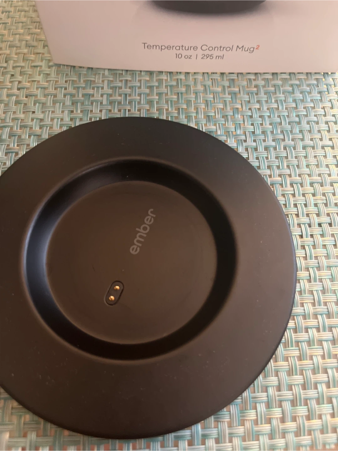 Ember Temperature Control Mug² in black. This is the 10 oz (295 ml) version. It's designed to keep your drink at the perfect temperature. Includes charging coaster and power adapter.