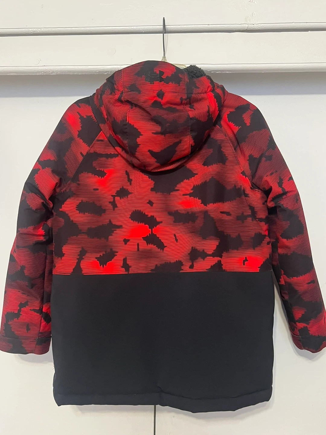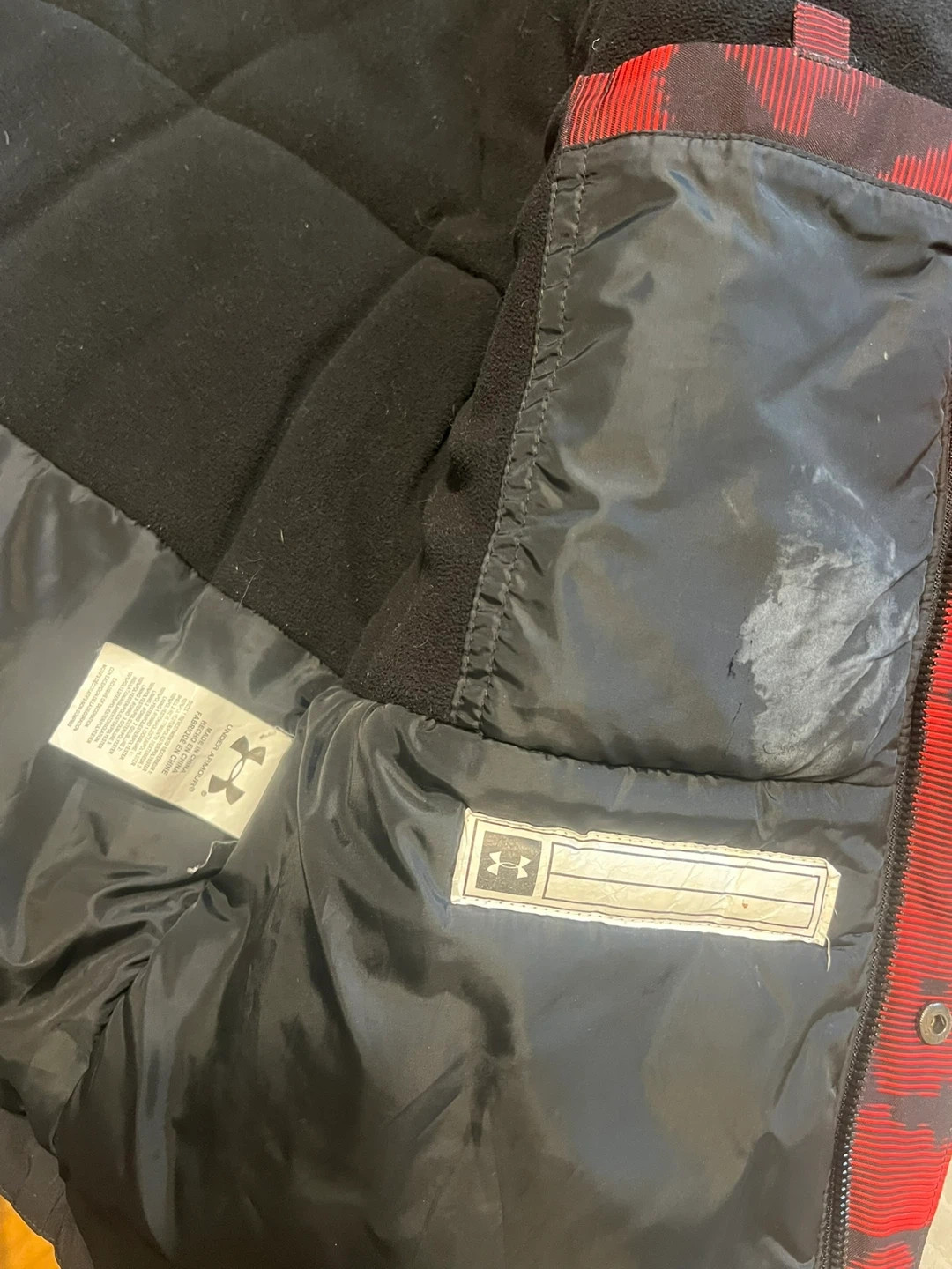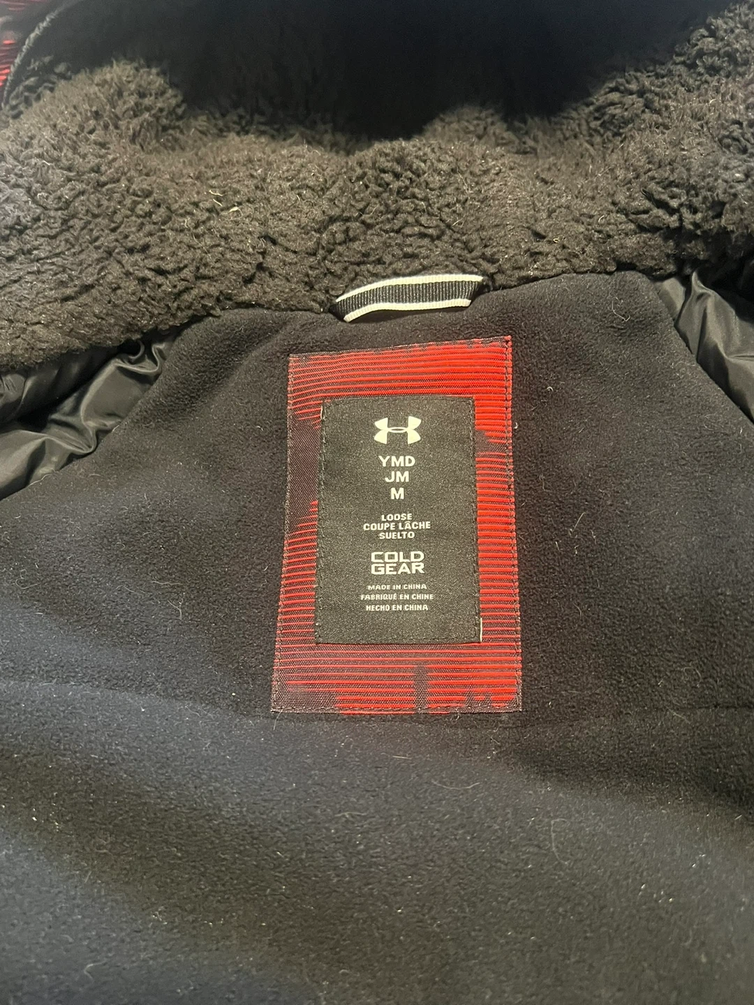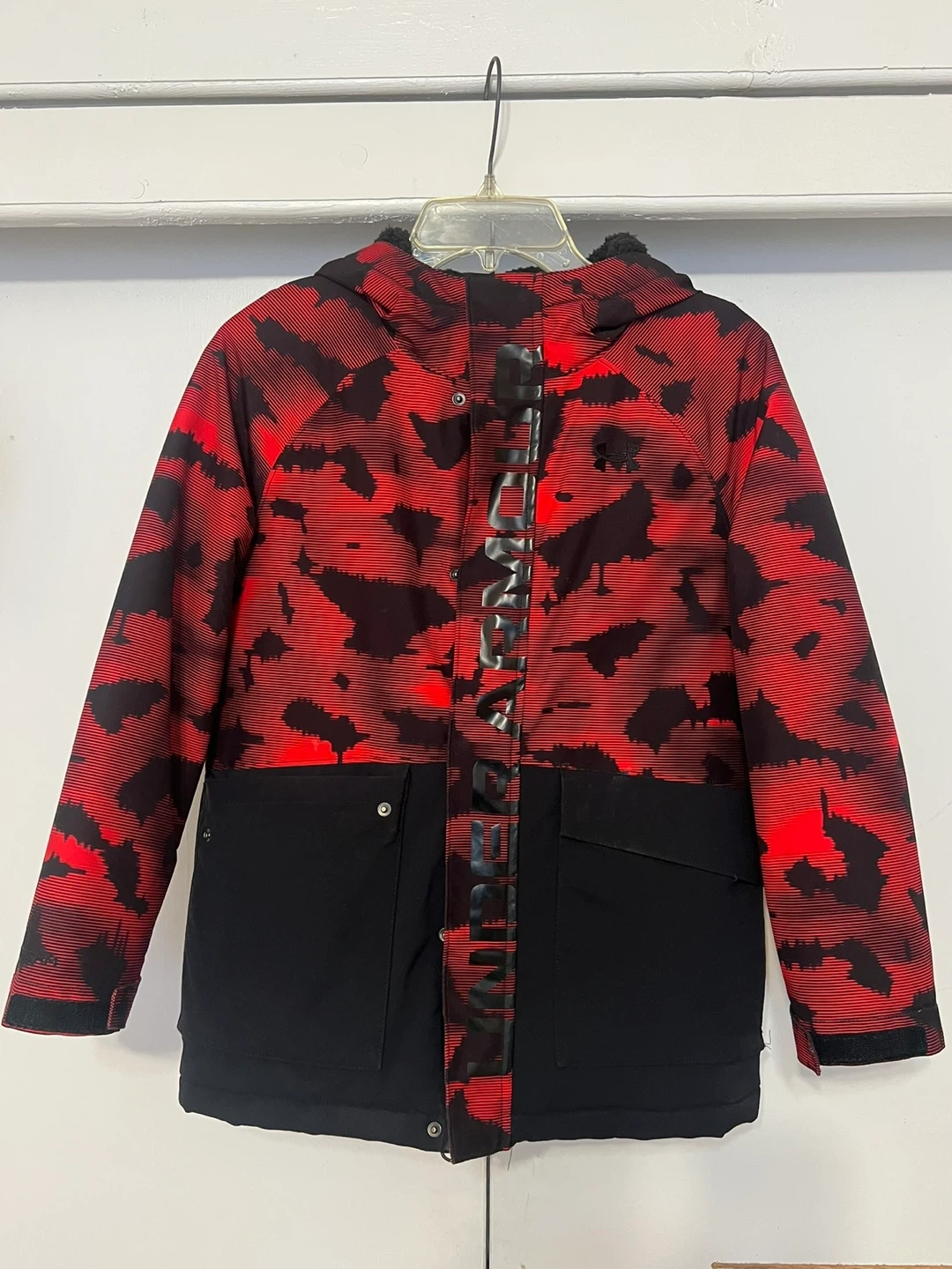 This Under Armour jacket is size medium. It's designed with Cold Gear technology. The outer shell is black and red with a camouflage pattern.