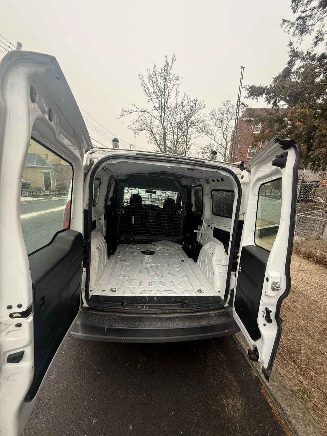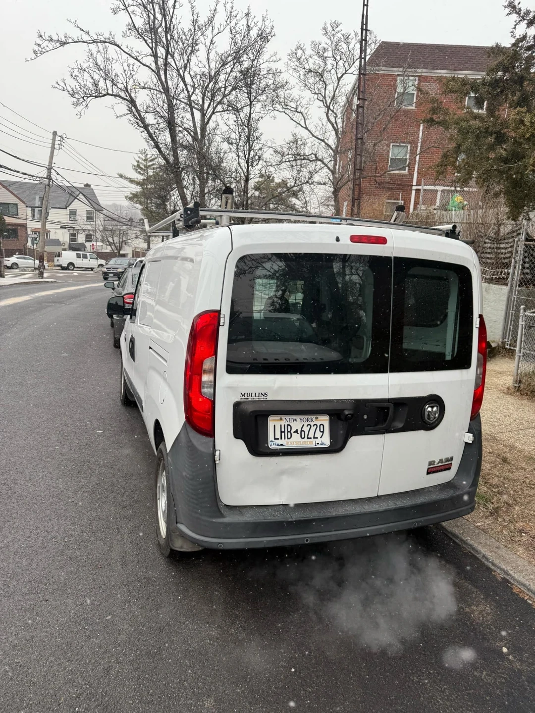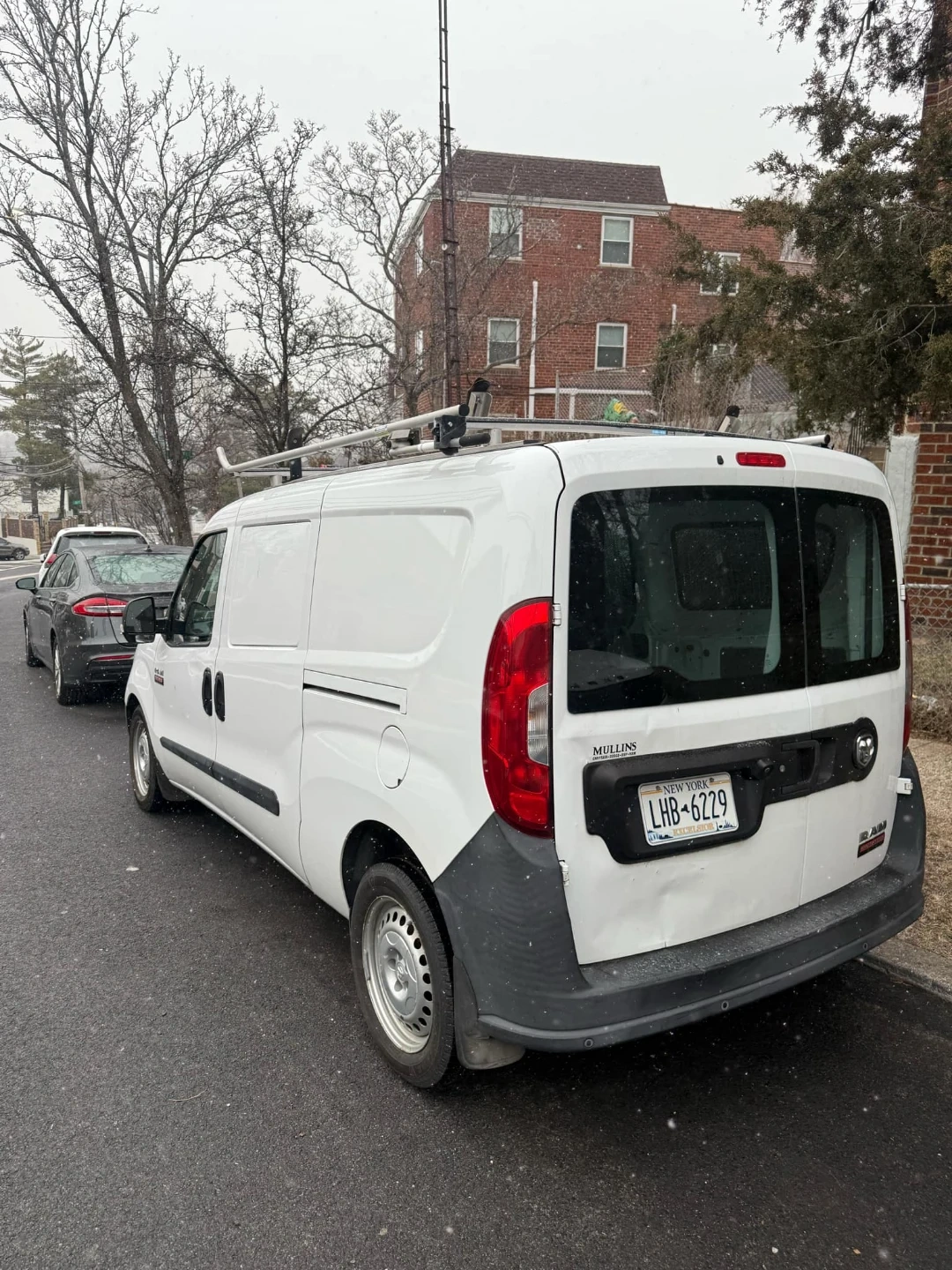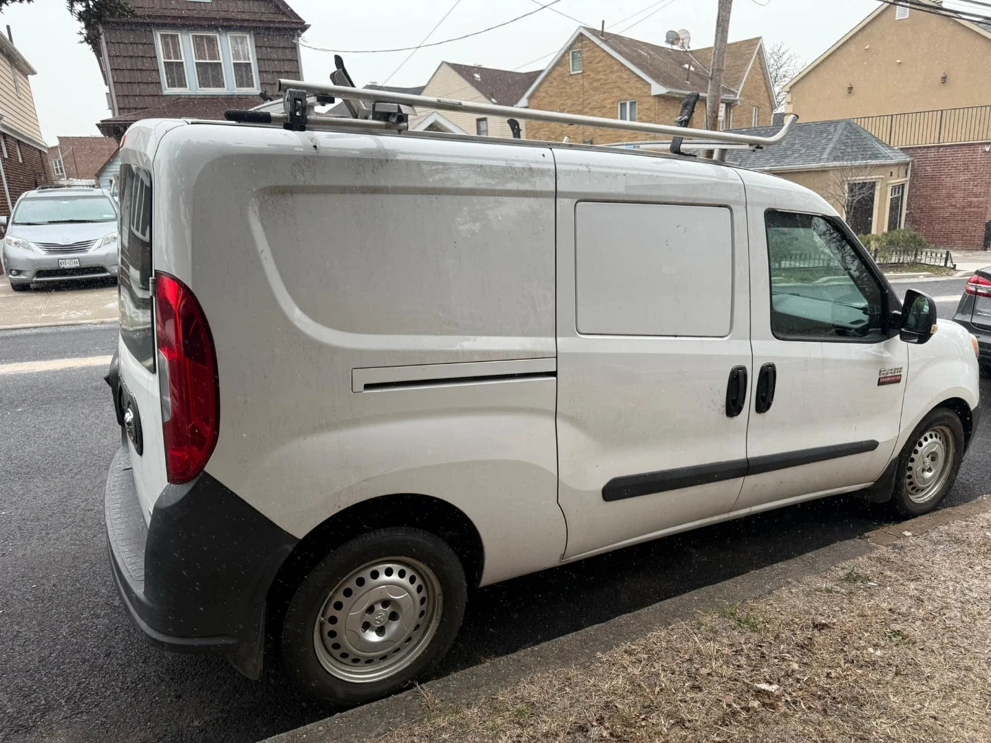 Selling a 2015 RAM ProMaster City cargo van. It's white and has a roof rack. The odometer reads 102566 miles. 4 cilindros