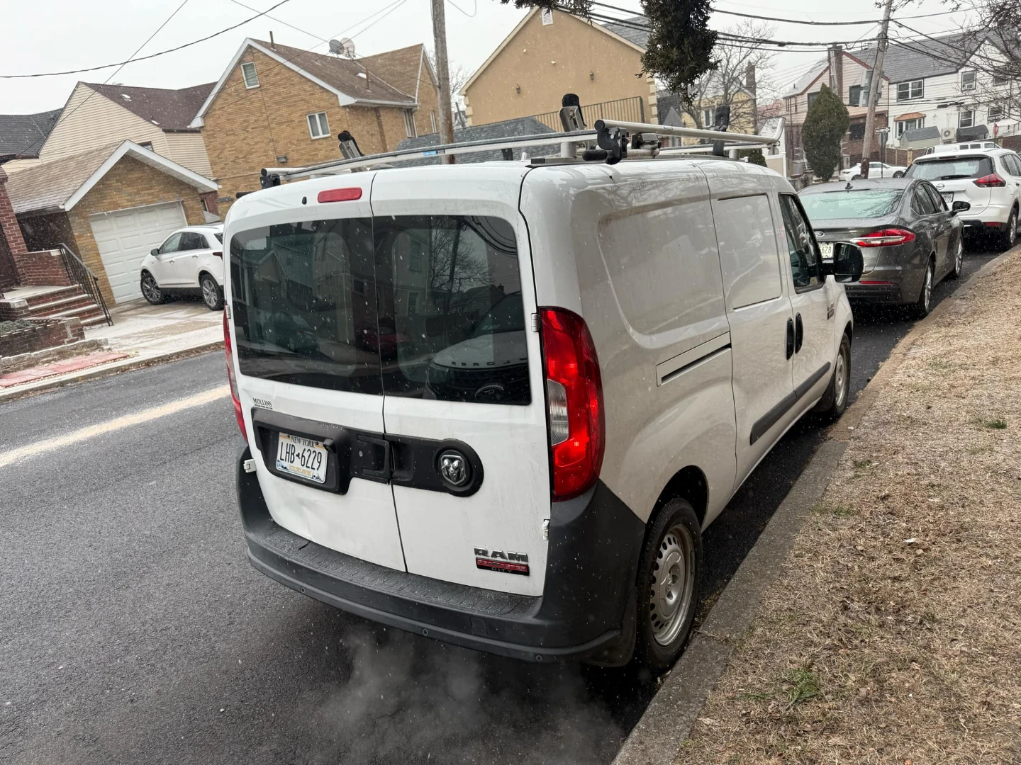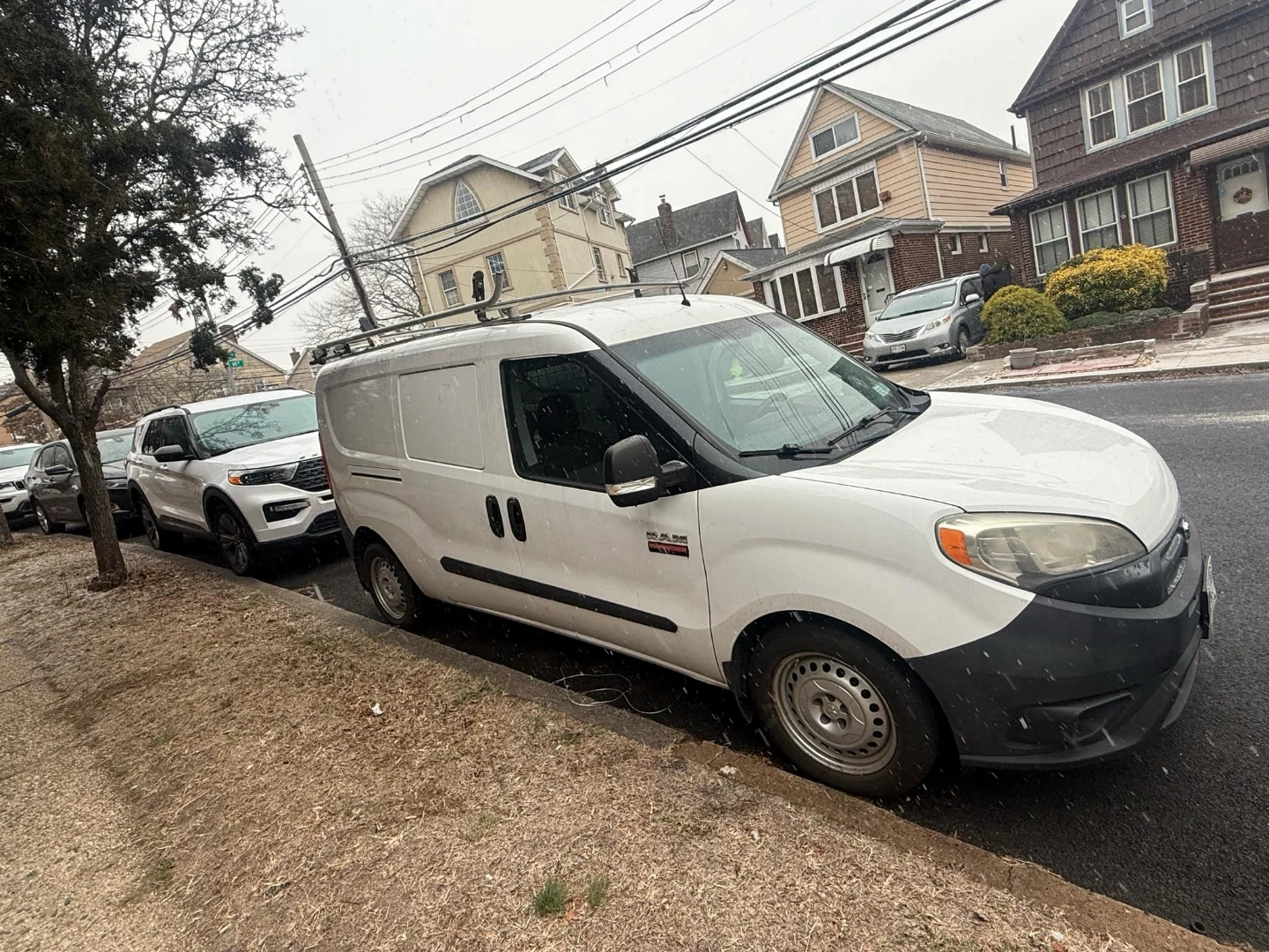 Selling a 2015 RAM ProMaster City cargo van. It's white and has a roof rack. The odometer reads 102566 miles. 4 cilindros