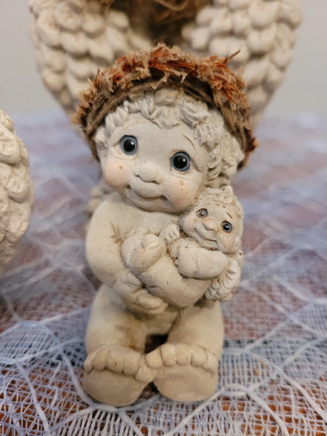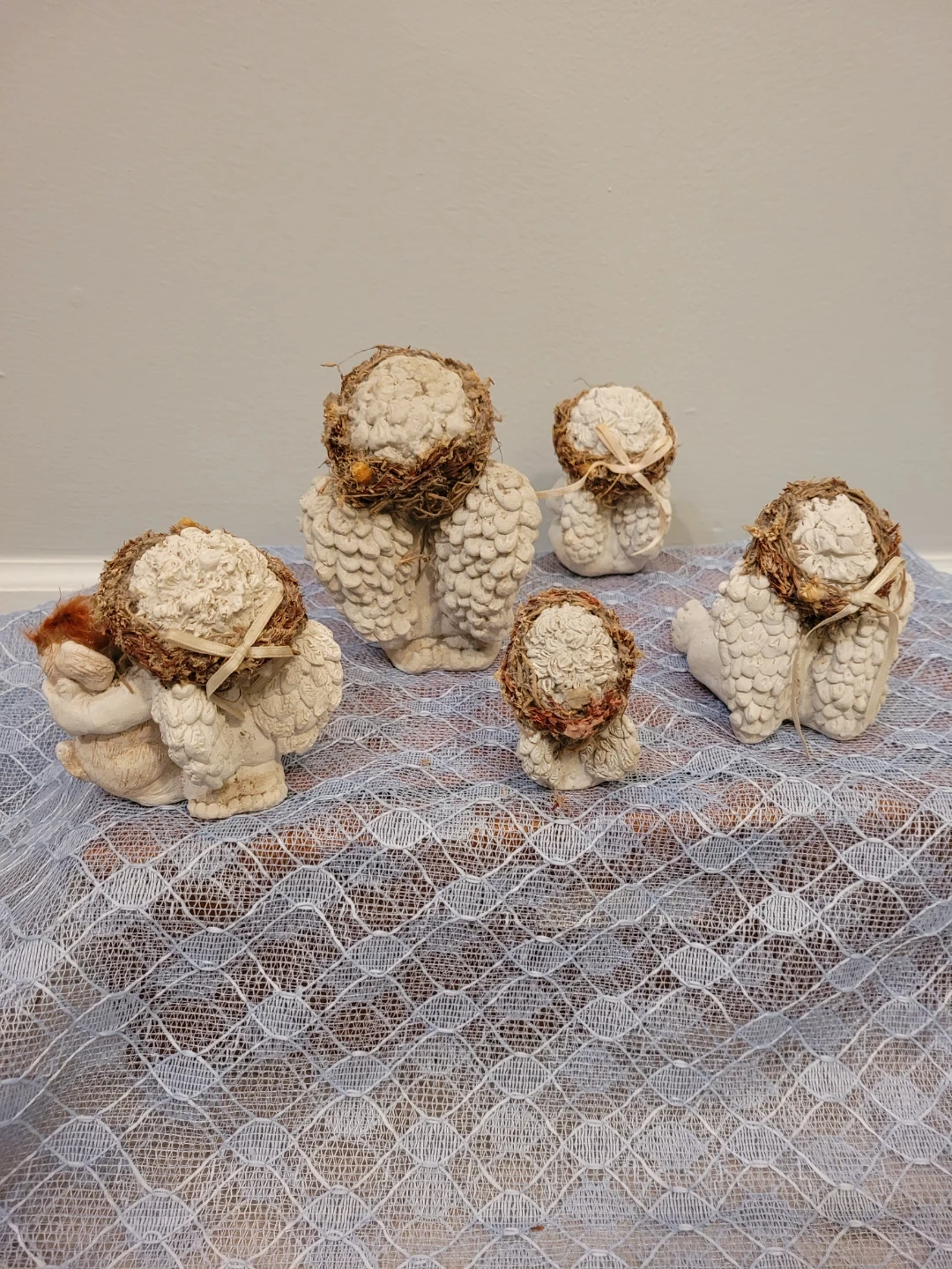 Selling a set of 5 cute dreamsicle angel figurines altogether for price. Three in good condition and two are okay condition see close up photos of their feet. All show some wear and can be spruced up. They would make a lovely addition to any home decor.