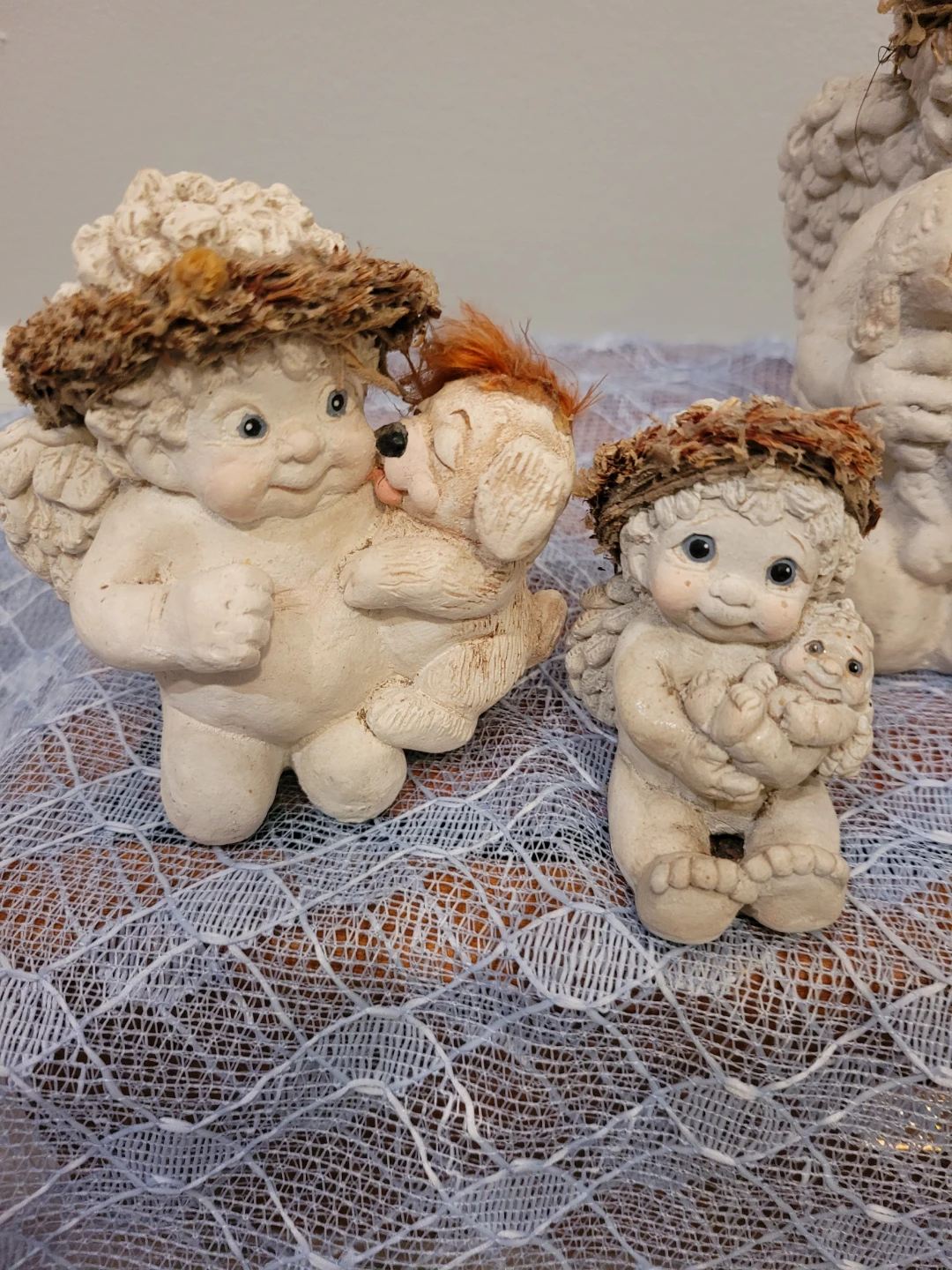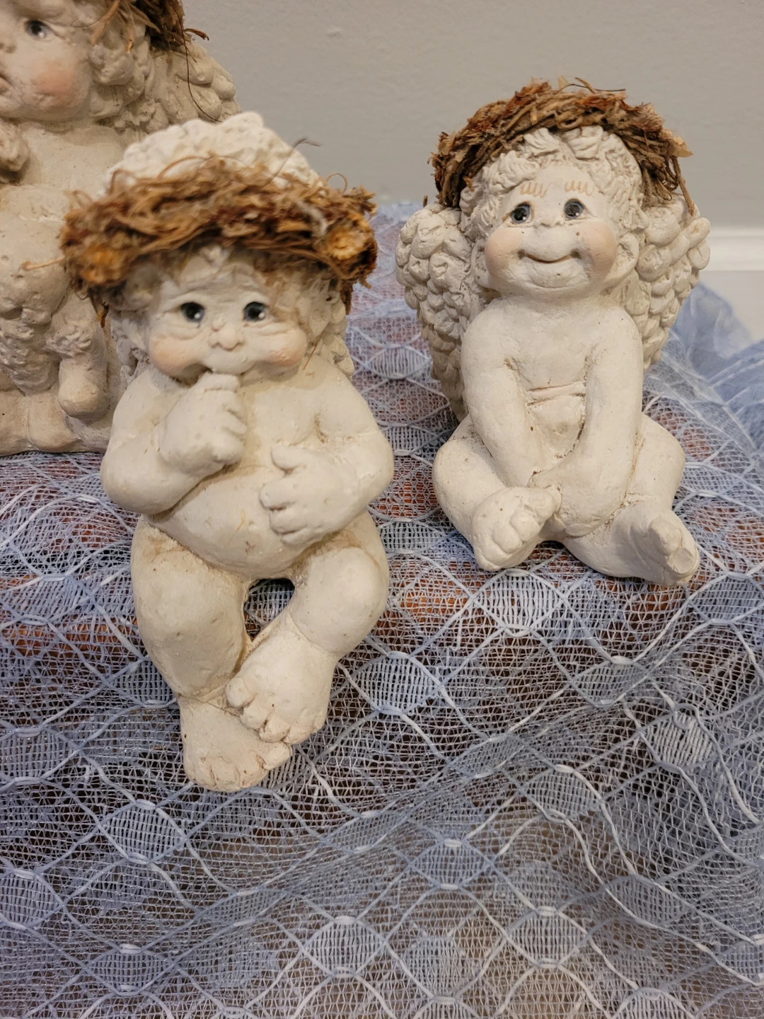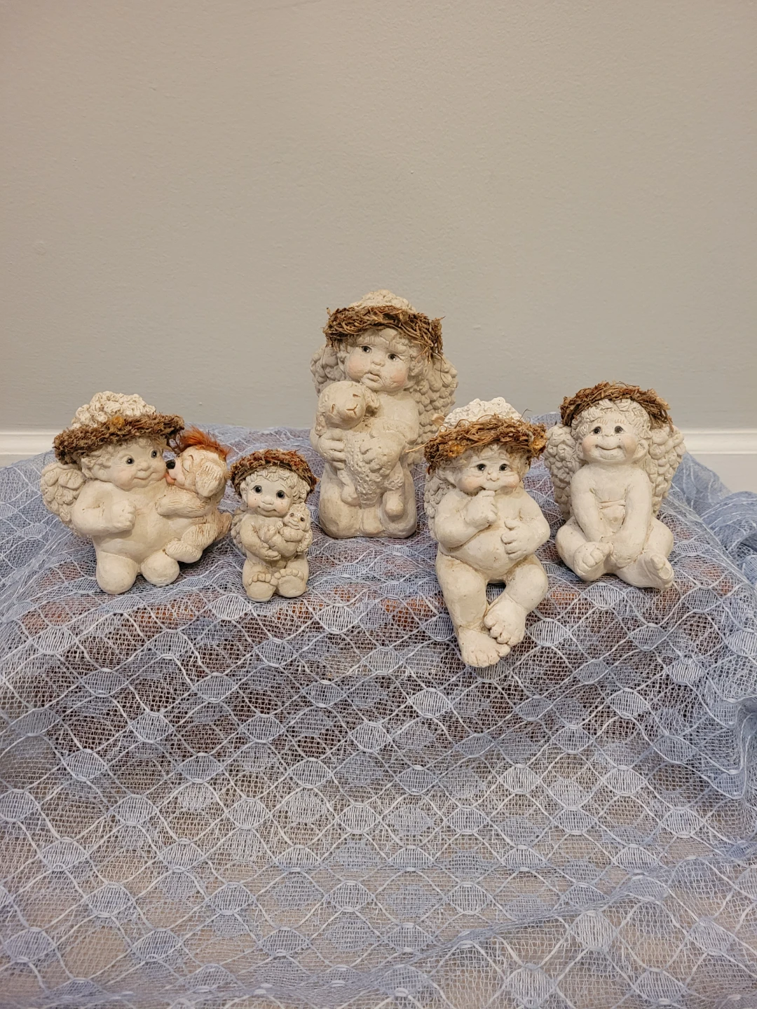 Selling a set of 5 cute dreamsicle angel figurines altogether for price. Three in good condition and two are okay condition see close up photos of their feet. All show some wear and can be spruced up. They would make a lovely addition to any home decor.