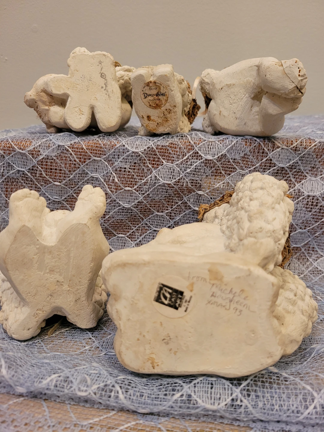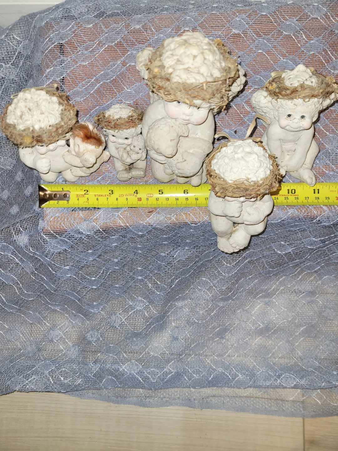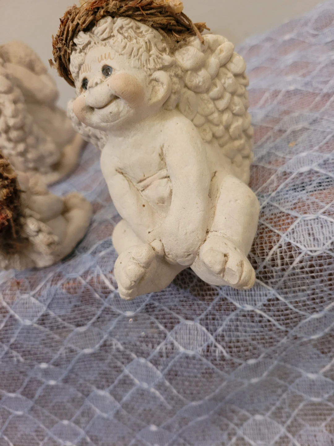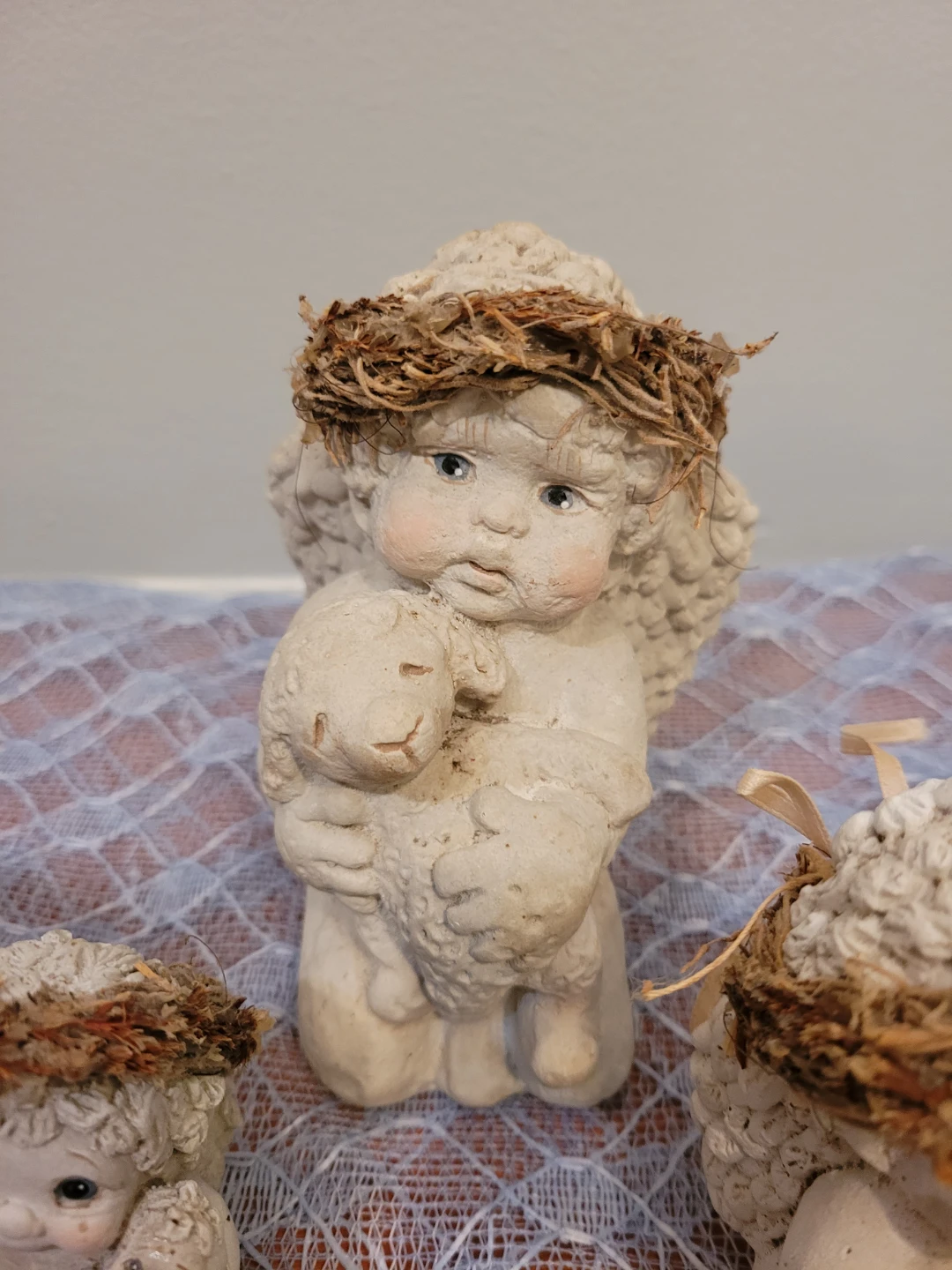 Selling a set of 5 cute dreamsicle angel figurines altogether for price. Three in good condition and two are okay condition see close up photos of their feet. All show some wear and can be spruced up. They would make a lovely addition to any home decor.