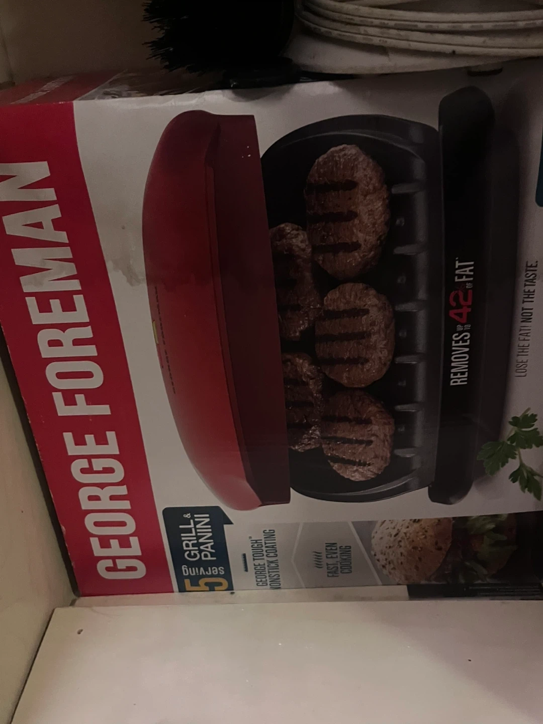 I'm selling a new George Foreman Grill & Panini press. It can cook up to 5 servings. It also has a George Tough nonstick coating and provides fast, even cooking! It removes up to 42% of fat