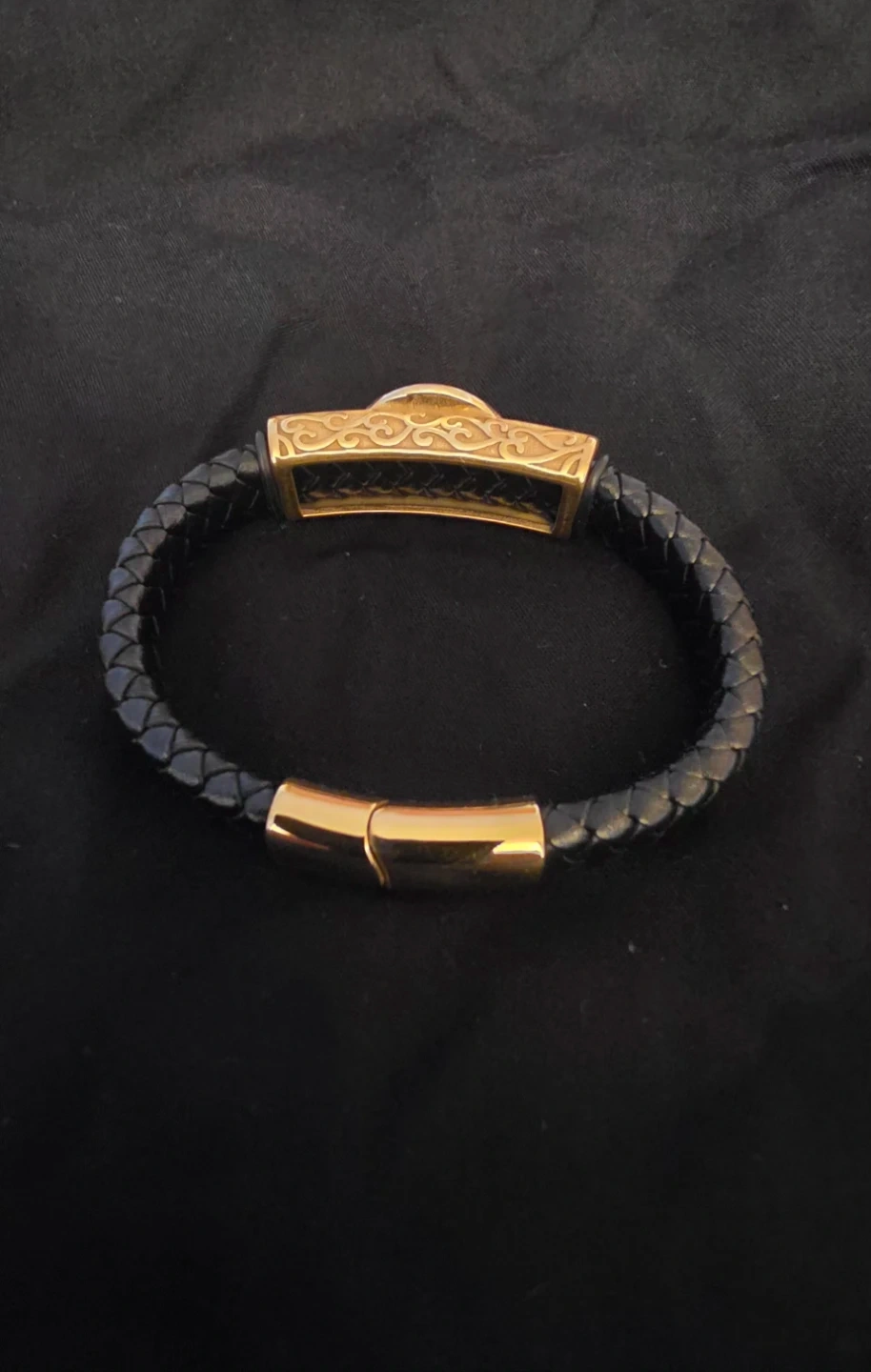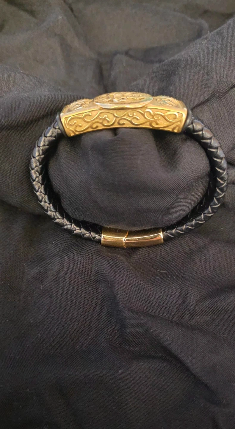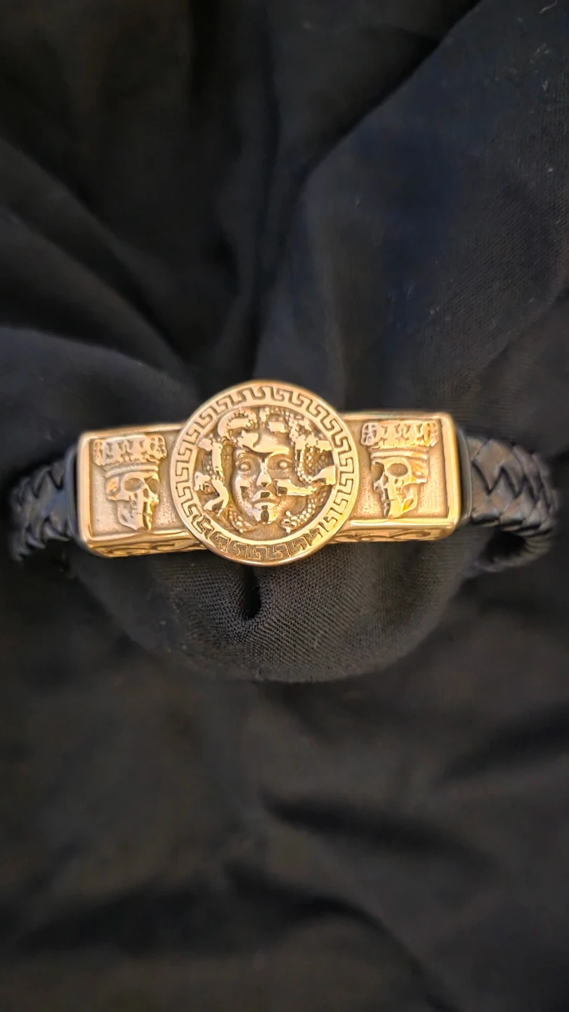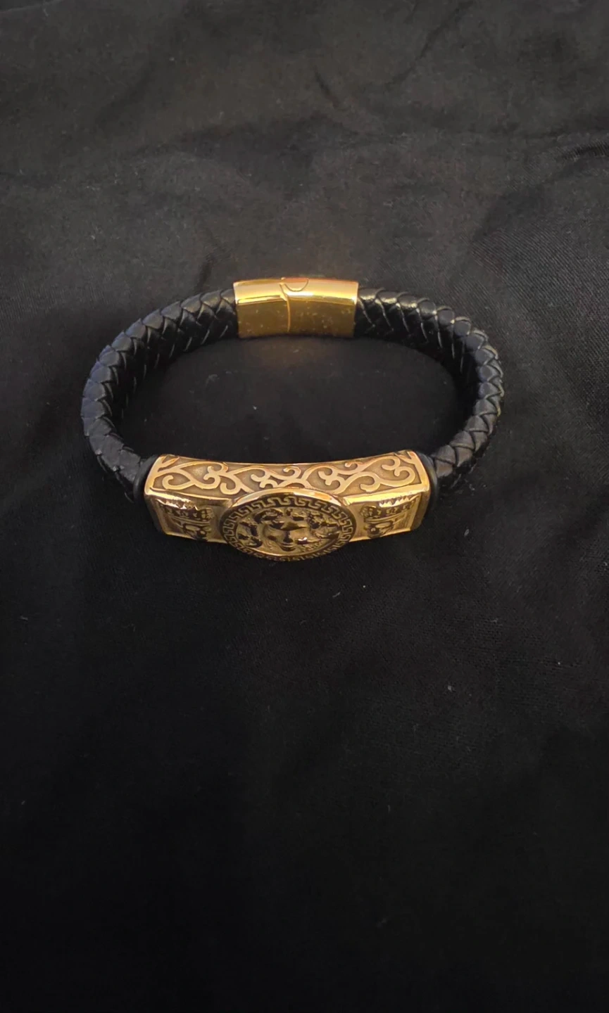 This is a Versace bracelet featuring the iconic Medusa head. It has a black braided leather band with gold-tone hardware. It's a stylish accessory to add a touch of luxury to any outfit!