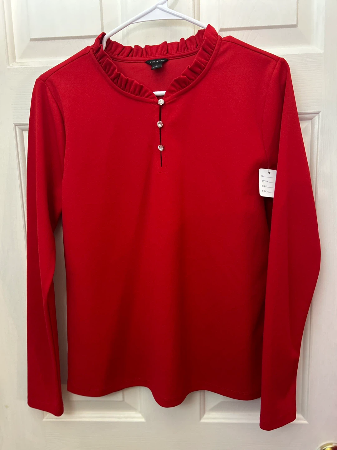 This Ann Taylor top features a red color with a ruffled neckline. It has decorative gem buttons down the front. Long sleeves complete the look. It's a stylish choice for many occasions!