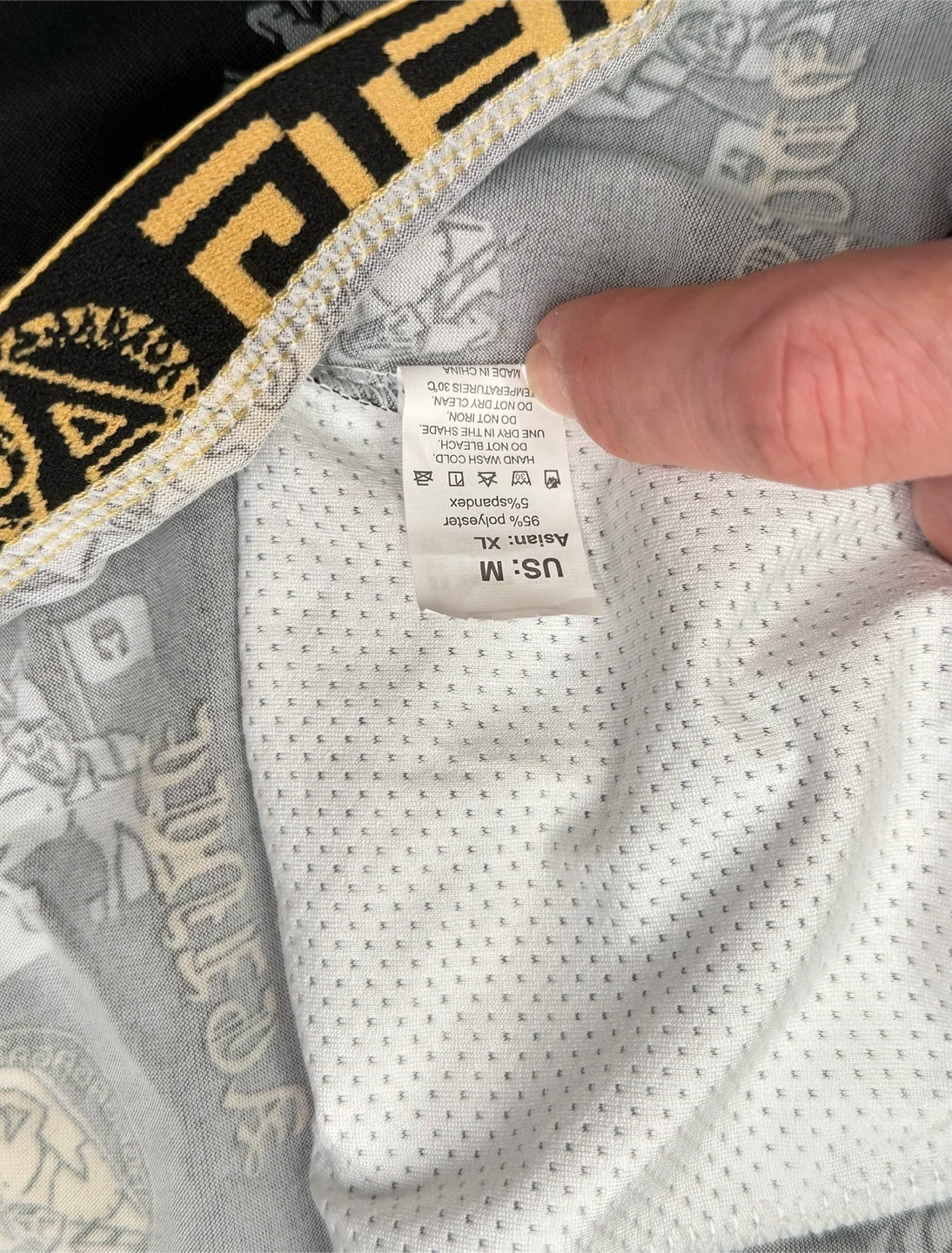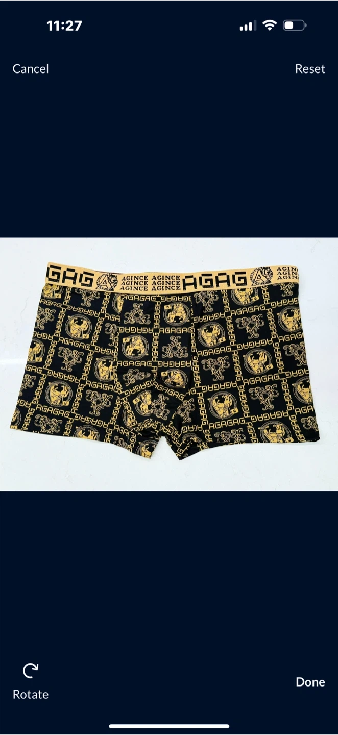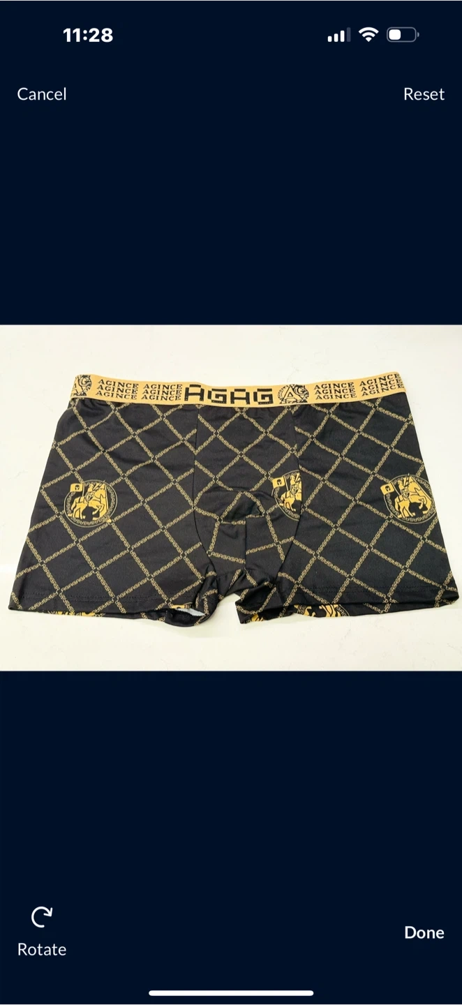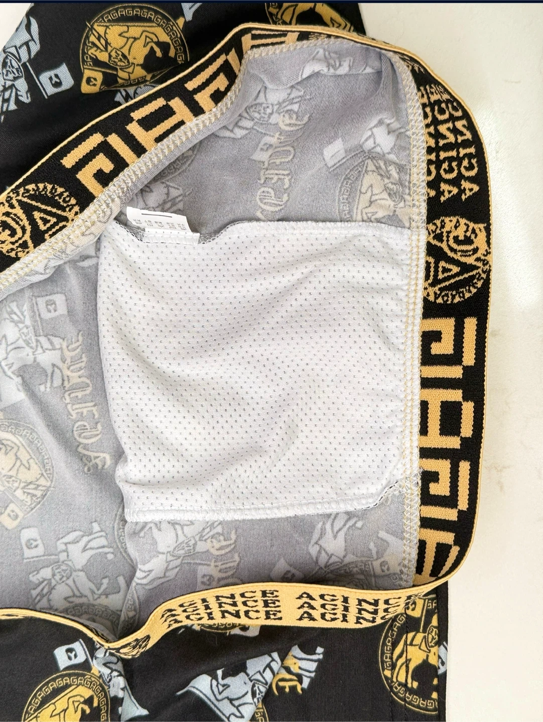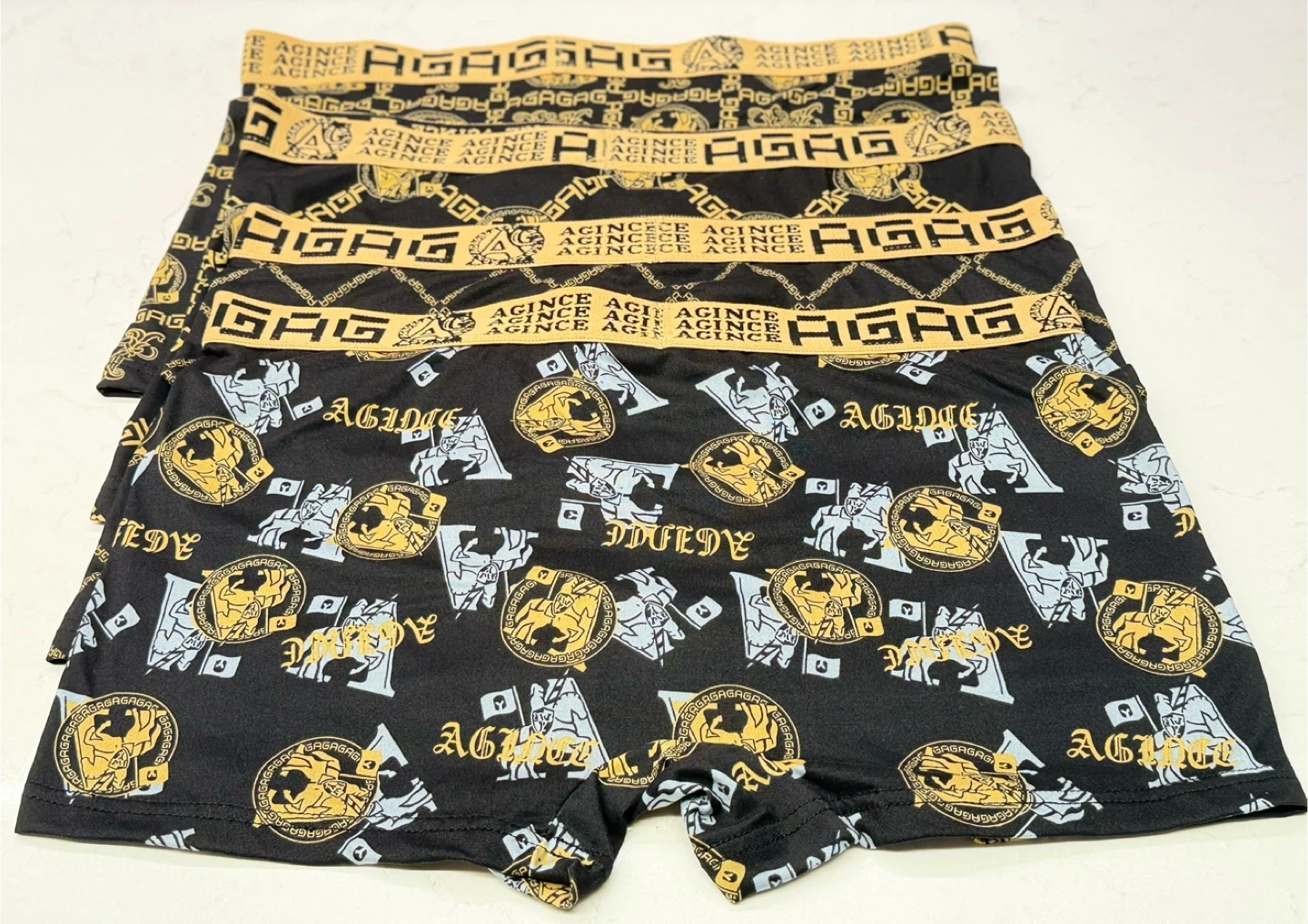 Selling a New inside package 4 set of AGAG men's boxer briefs. The boxer briefs are black with a gold and white design and the AGAG logo on the waistband.