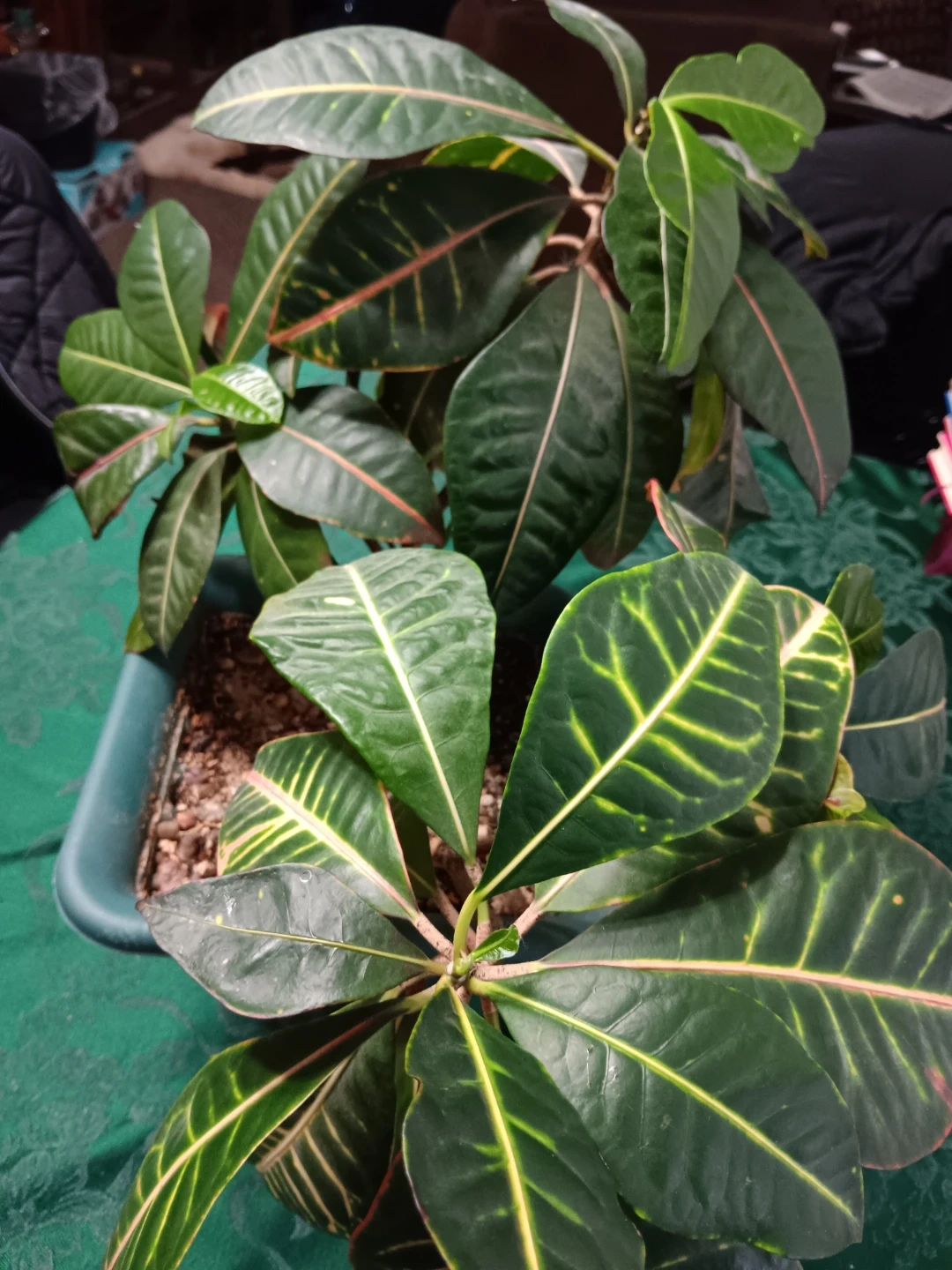 Selling a healthy croton plant in a green pot. It has vibrant green leaves with yellow and red veins. This plant would be a great addition to any home or office space!
