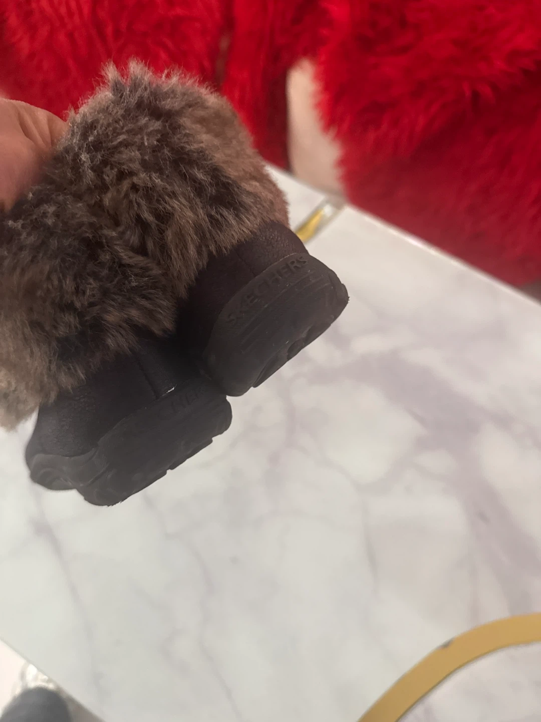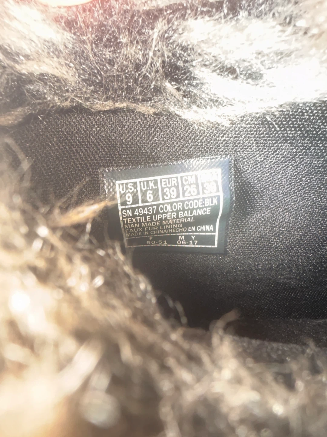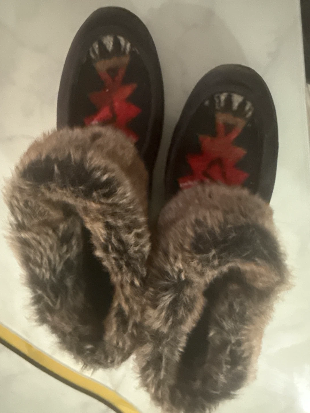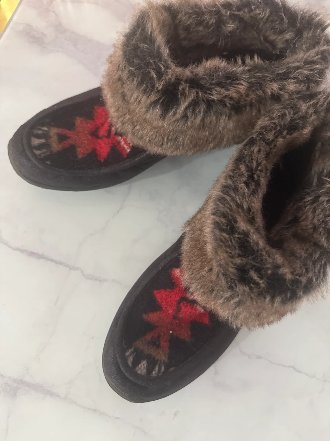 These Skechers moccasin boots are black with faux fur trim. They feature a textile upper and rubber sole. These are a women's size 9