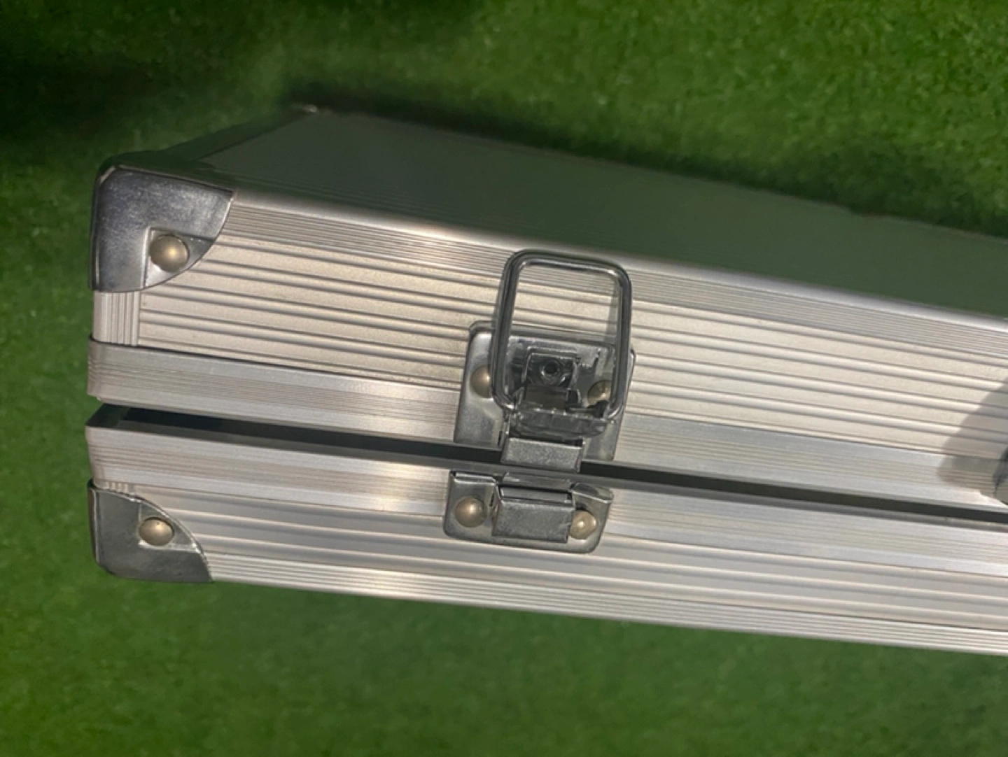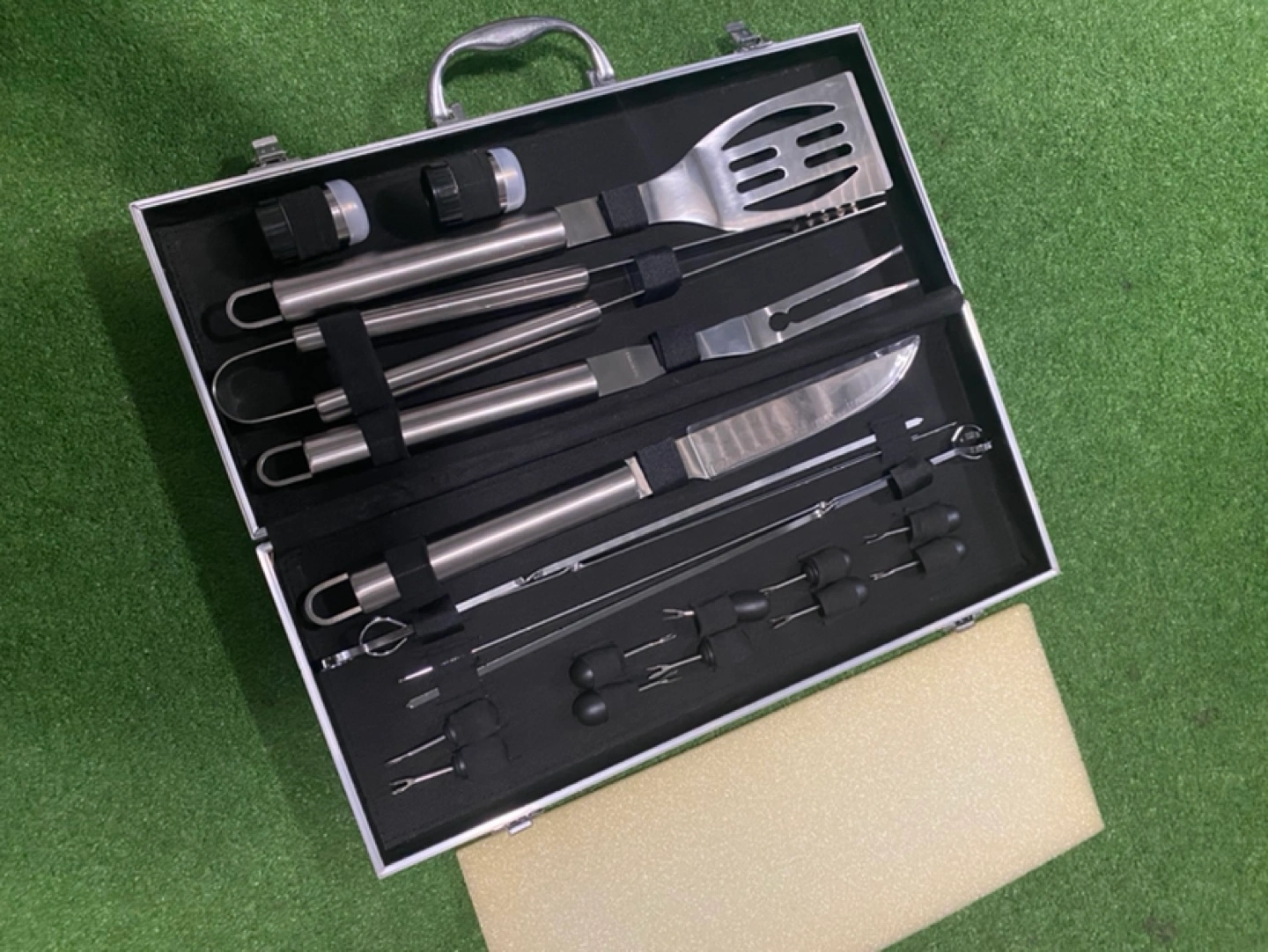 New, Stainless steel BBQ grill tool set or kitchen utensils in a carrying case. Includes spatula, fork, tongs, skewers, and a knife. Everything brand new ( SALE )