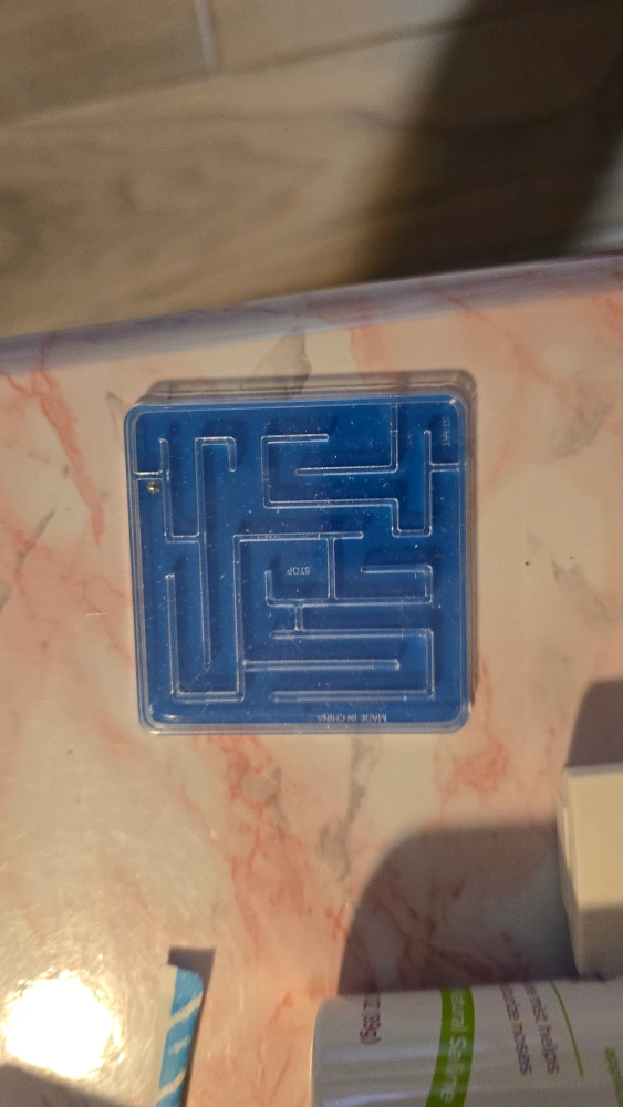 I'm selling a blue marble maze puzzle! It's a fun little game to keep your mind active. The maze is made of clear blue plastic, and there's a small metal ball inside. It reads 'STOP' in the center of the maze. It's in good condition and ready for a new home