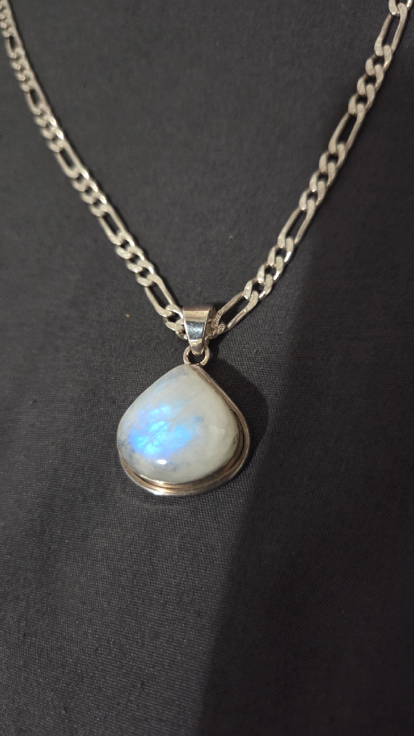 Selling a beautiful 925 Italy sterling silver diamond cut necklace with a moonstone pendant set in 925 italy sterling silver. The necklace is a classic figaro style. It's in great condition and ready to wear!