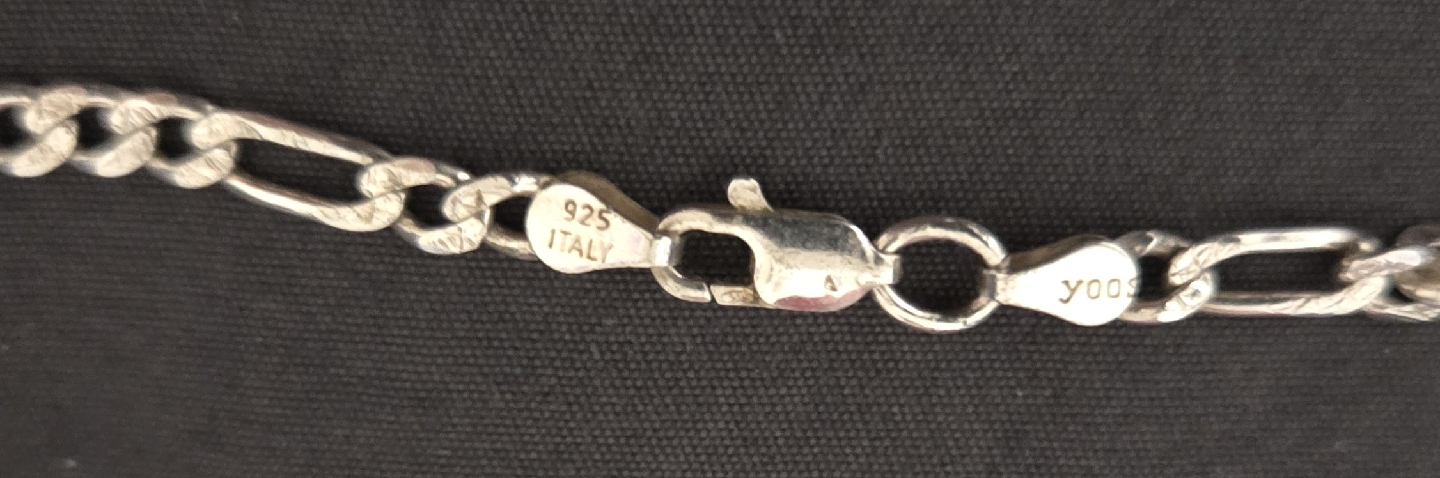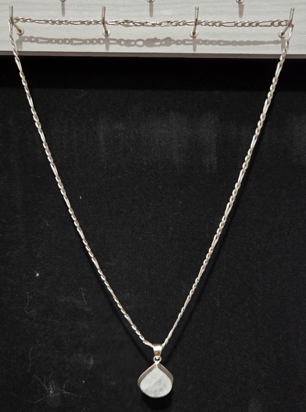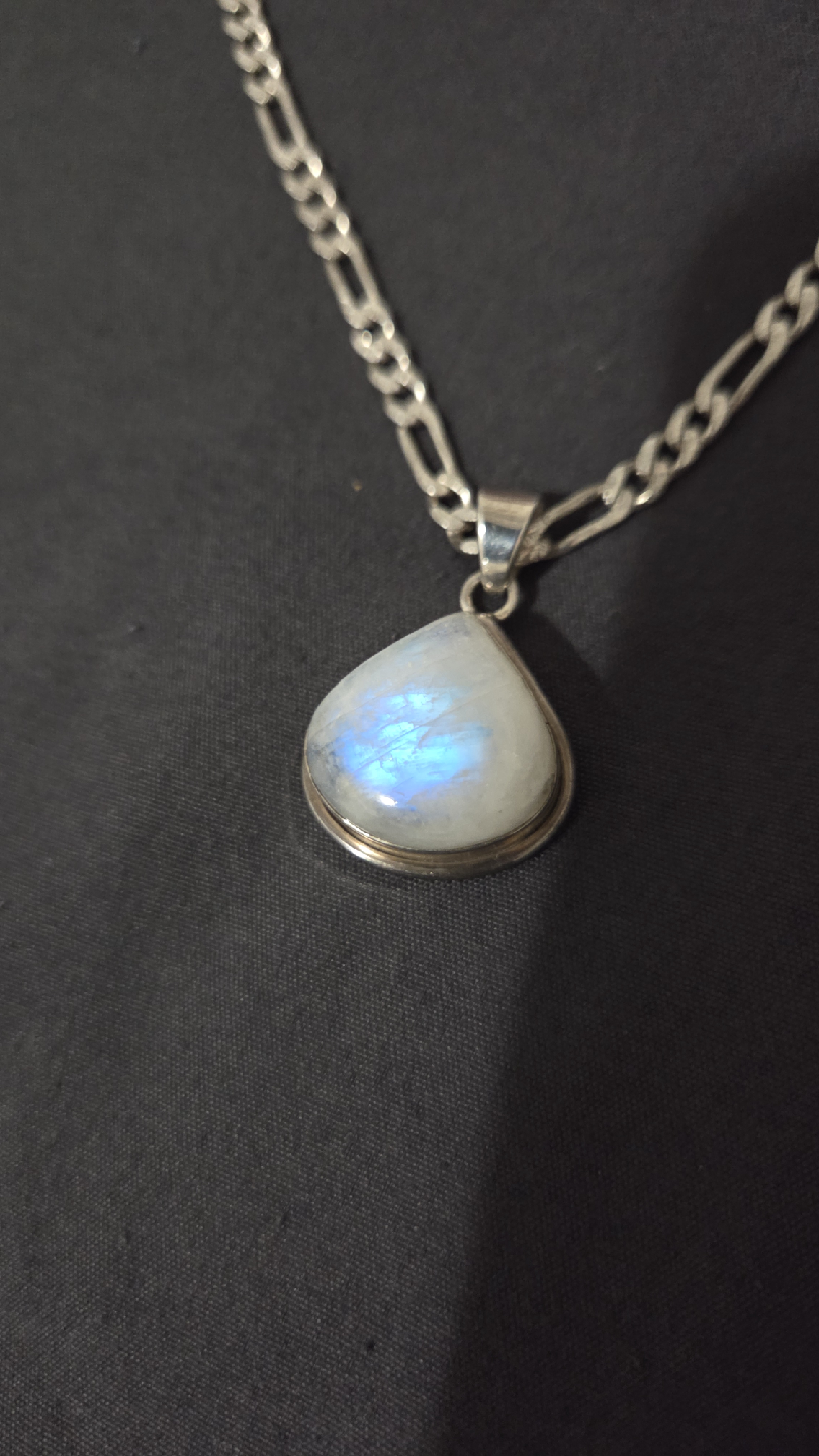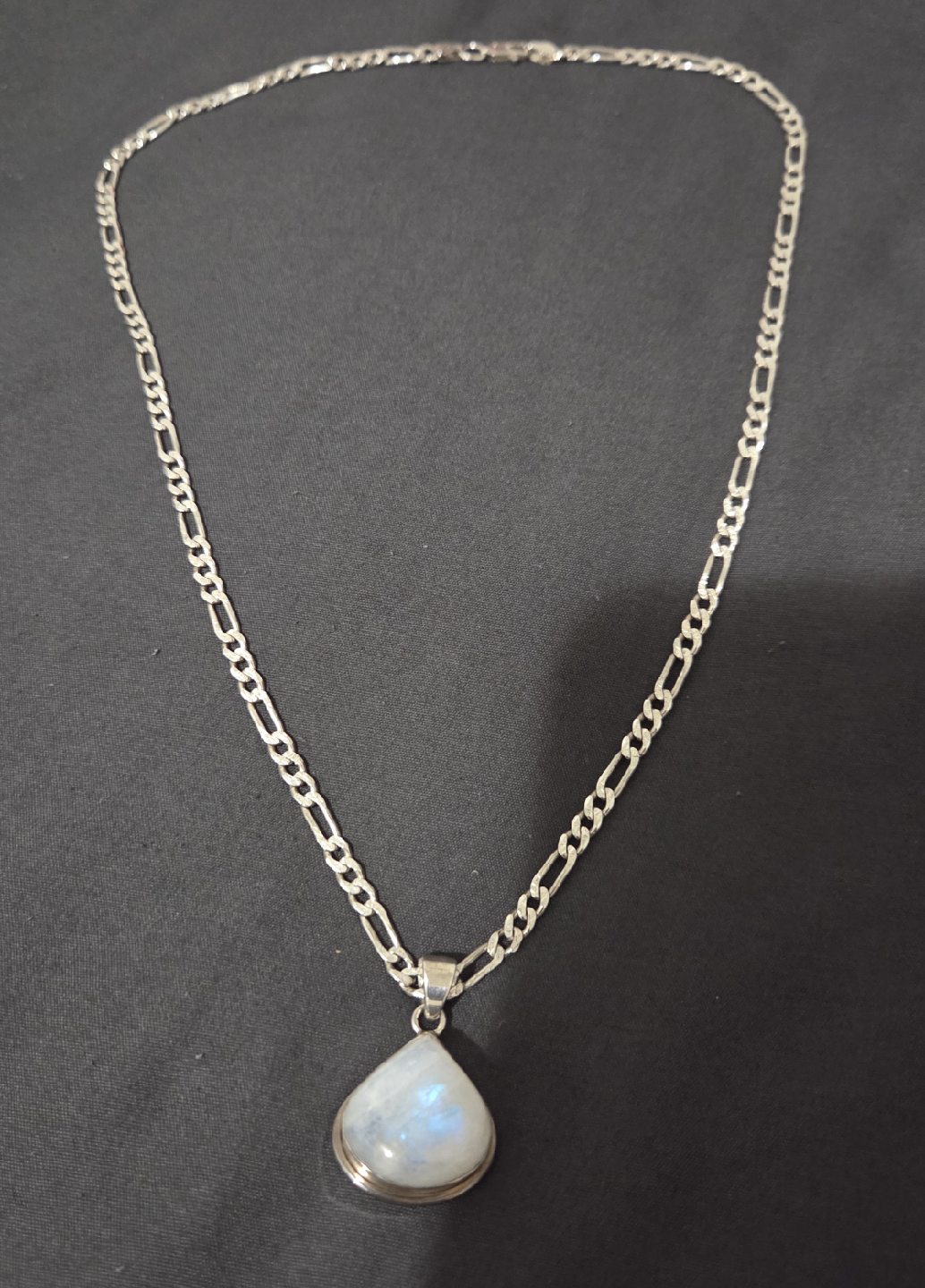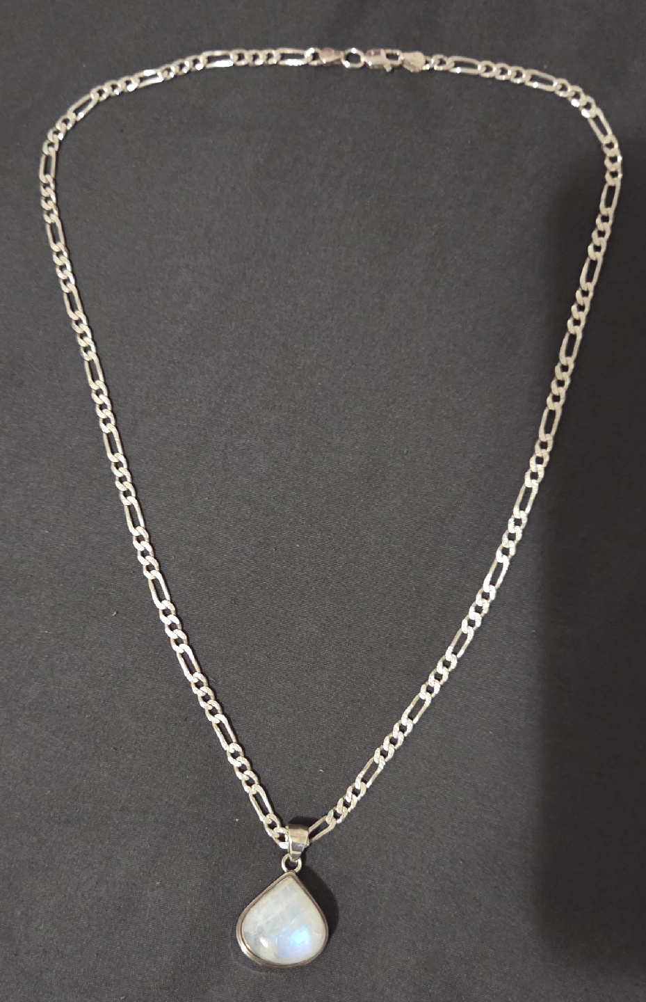 Selling a beautiful 925 Italy sterling silver diamond cut necklace with a moonstone pendant set in 925 italy sterling silver. The necklace is a classic figaro style. It's in great condition and ready to wear!