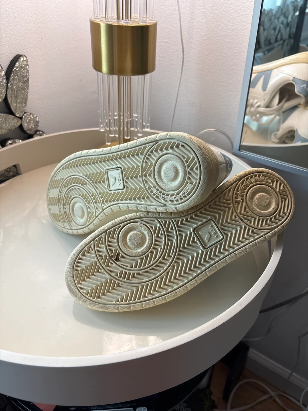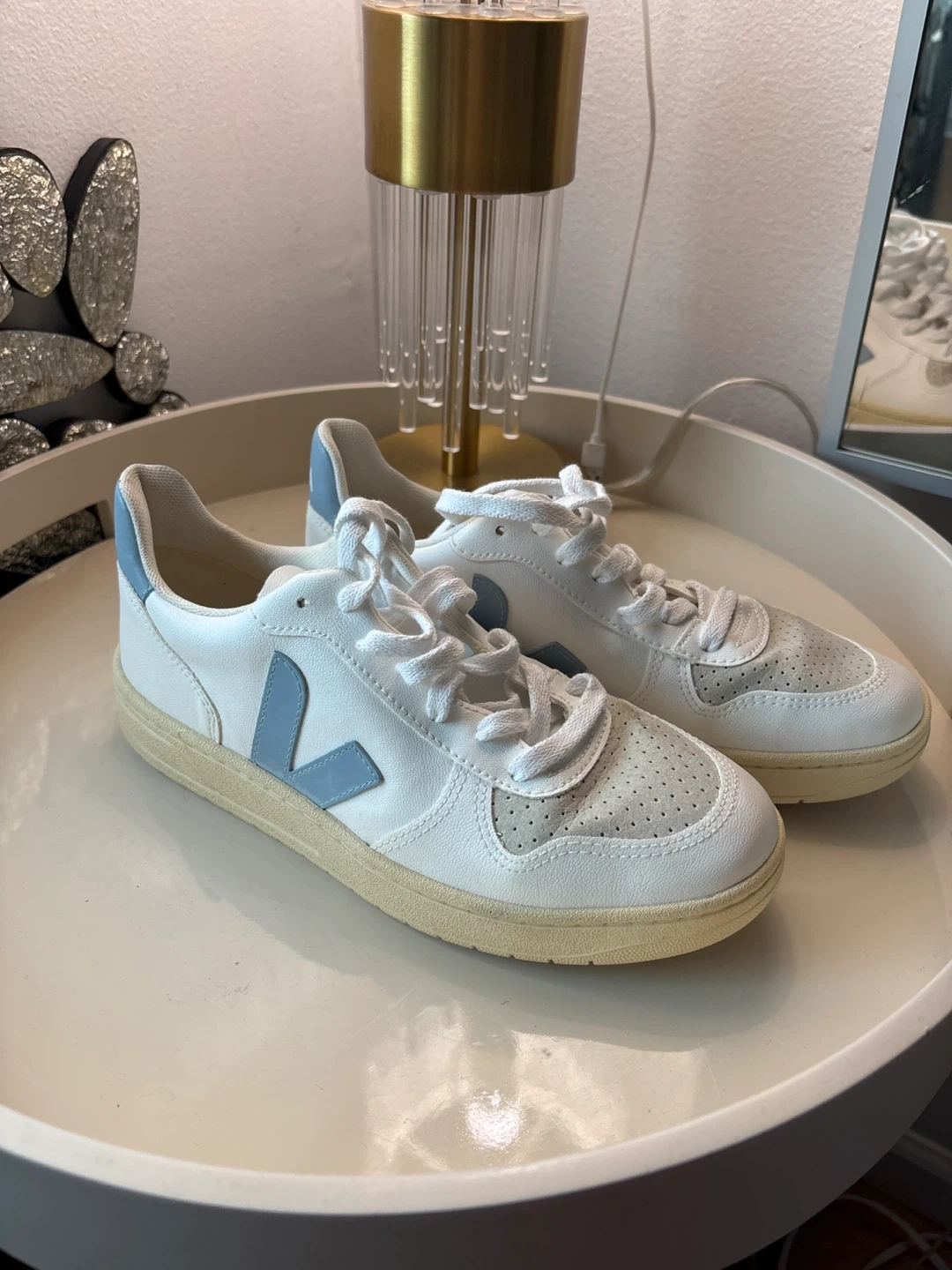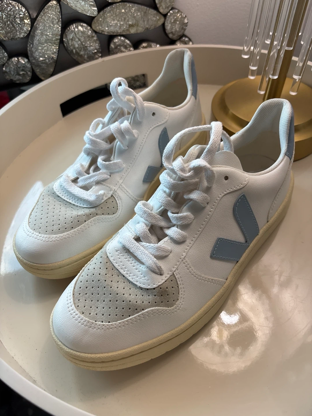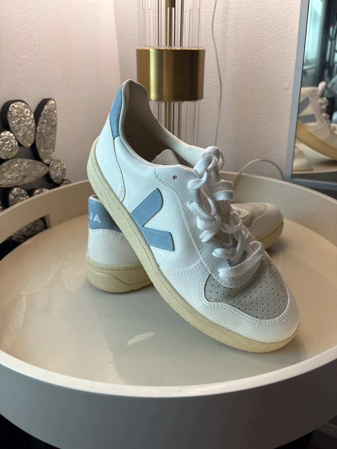 Selling a pair of Veja V-10 leather sneakers in white with blue accents. They're in great condition and ready for a new home! The V-10 style is known for its comfortable fit and sustainable materials.