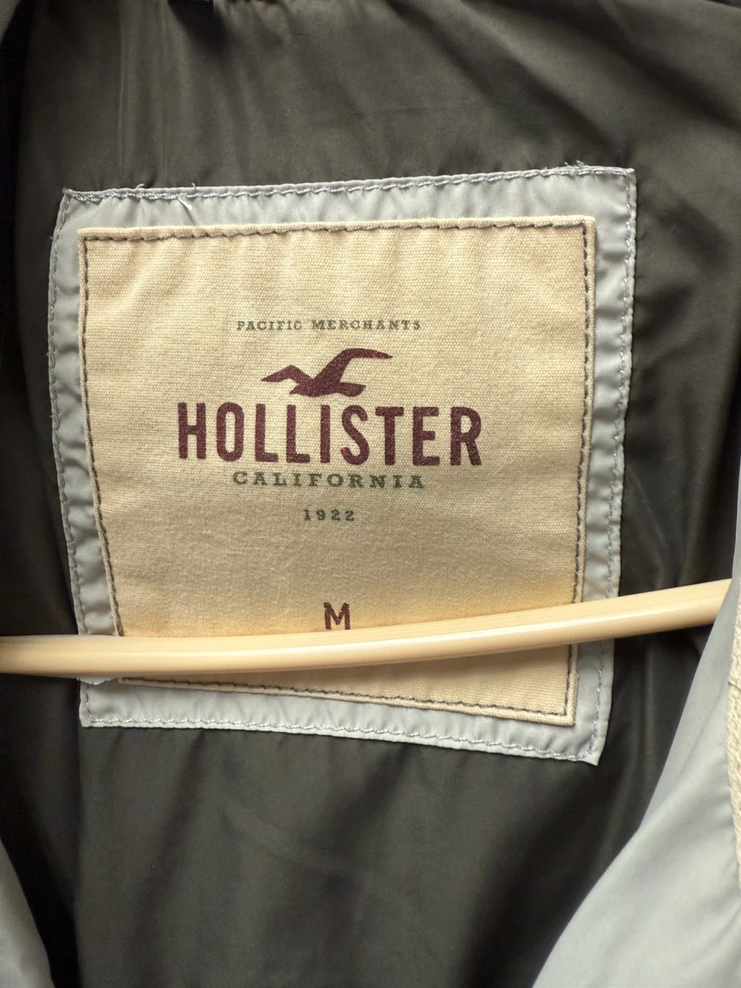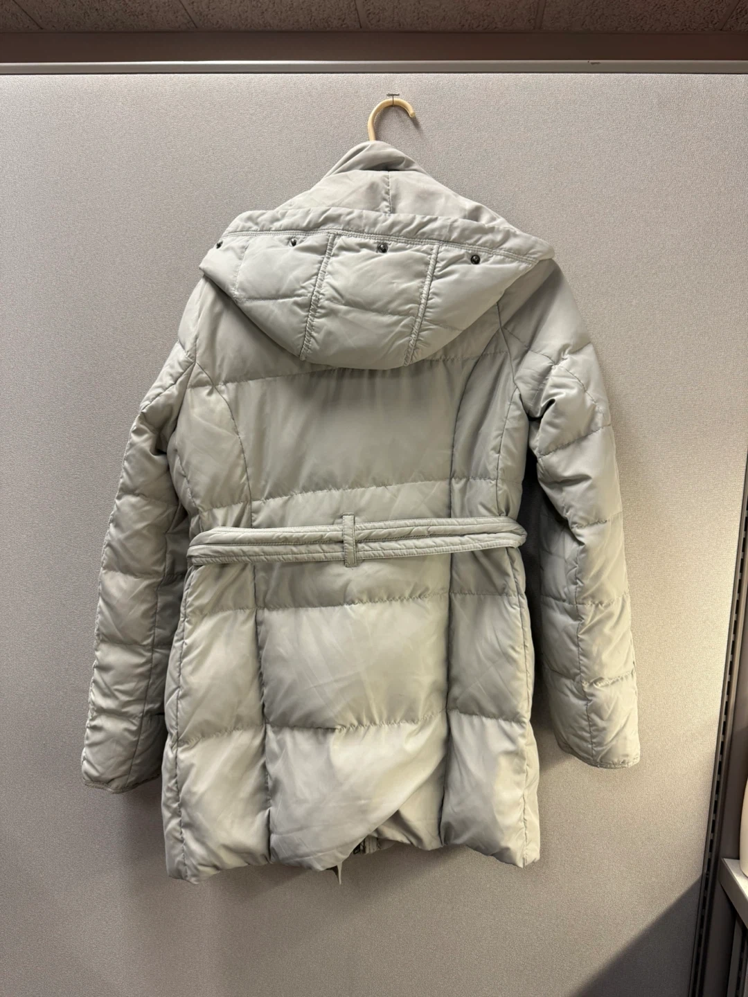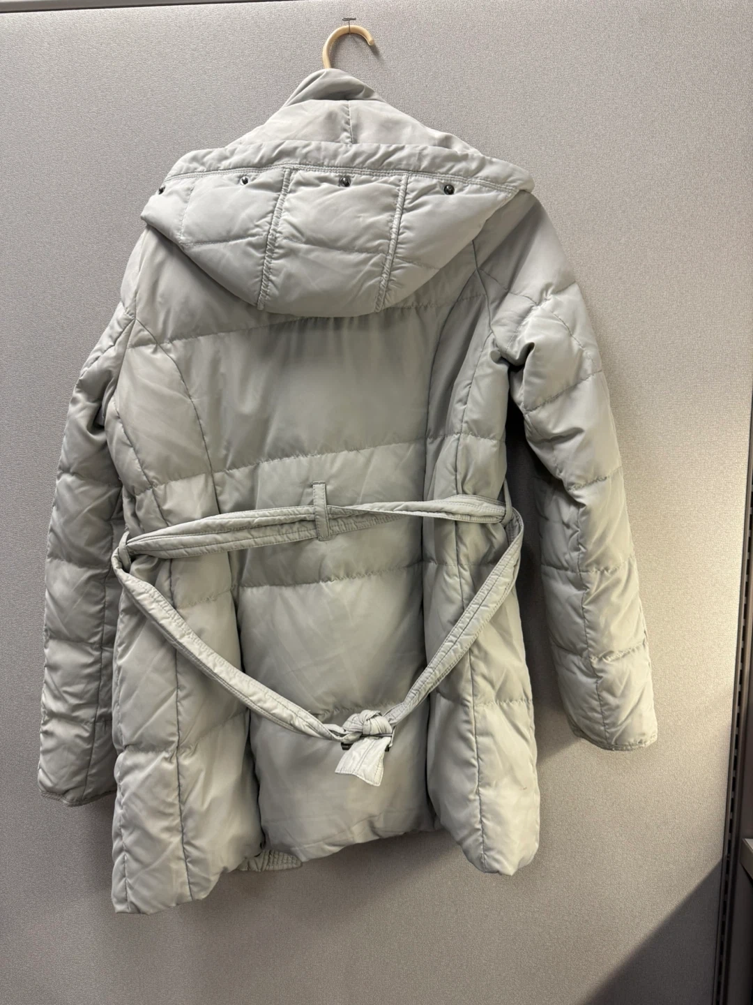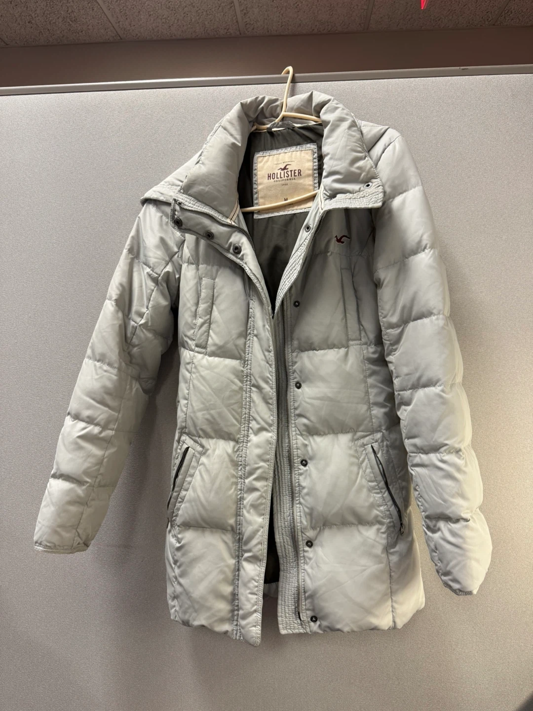 Selling a Hollister puffer coat in a light grey color. It's a size medium and features a hood and a tie around the waist. Perfect for staying warm and stylish!
