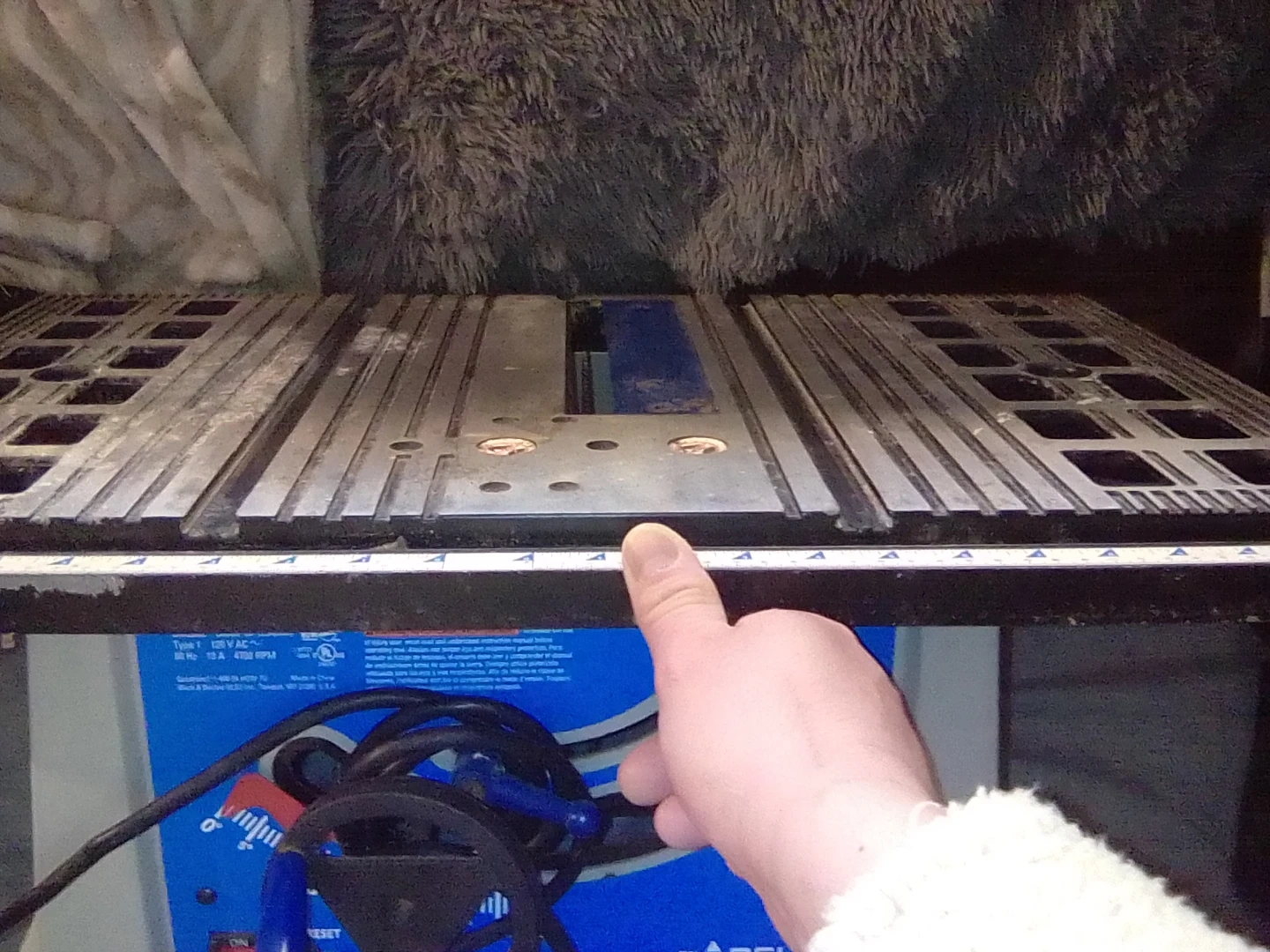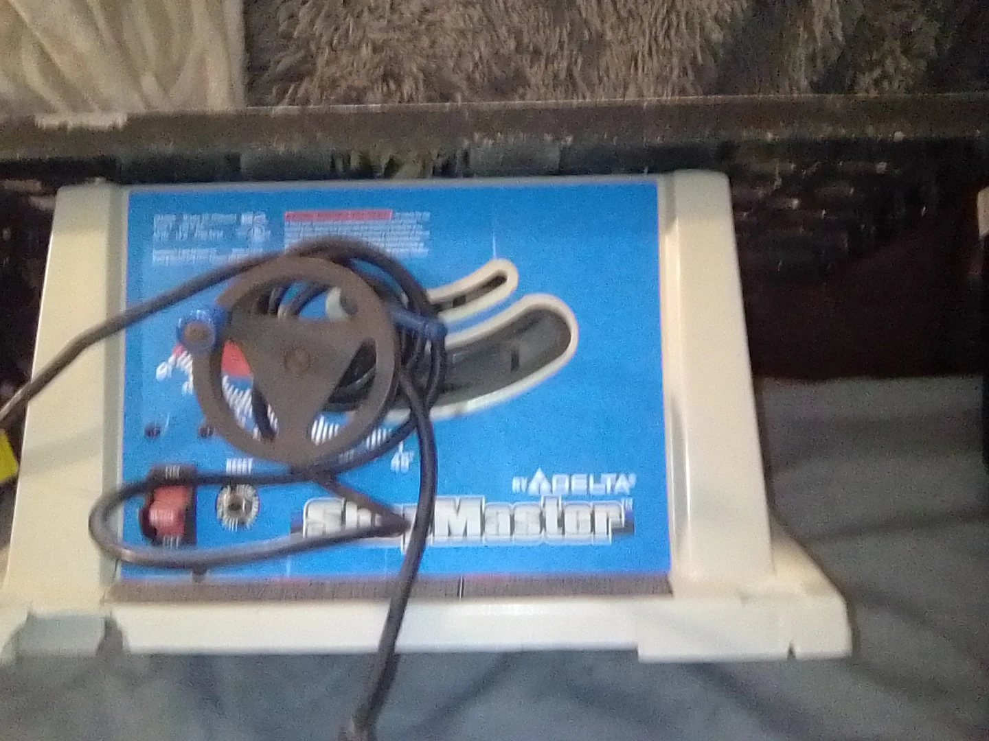 This is a Delta ShopMaster table saw. It's a compact and portable saw. It features a safety switch and a retractable blade.