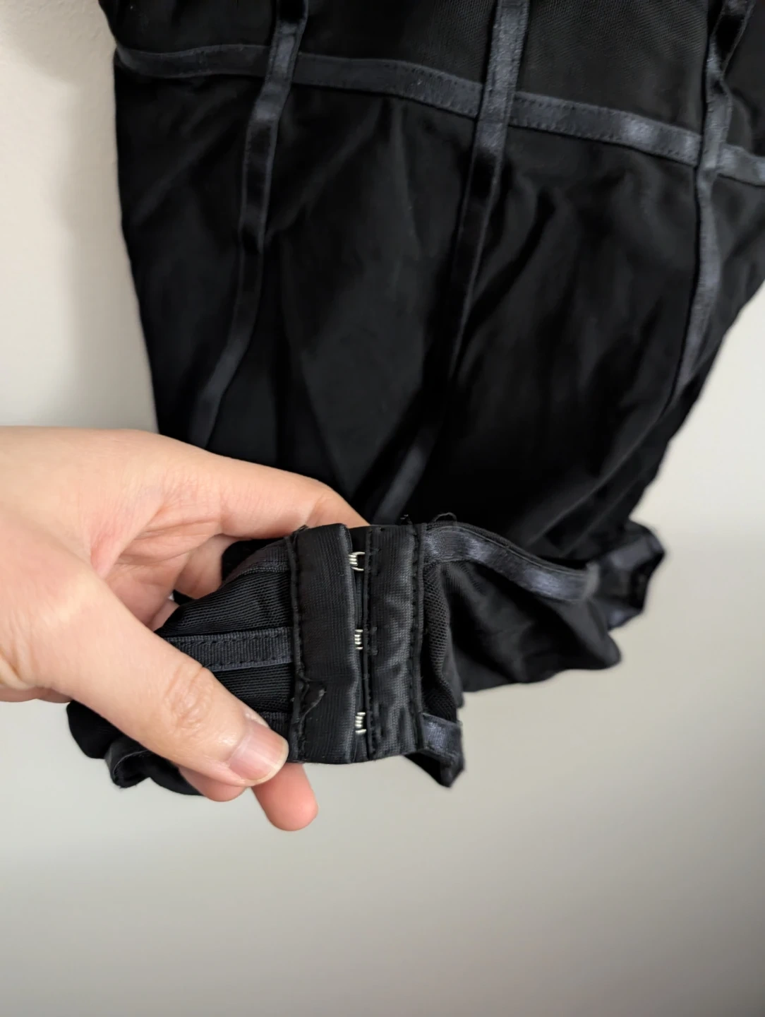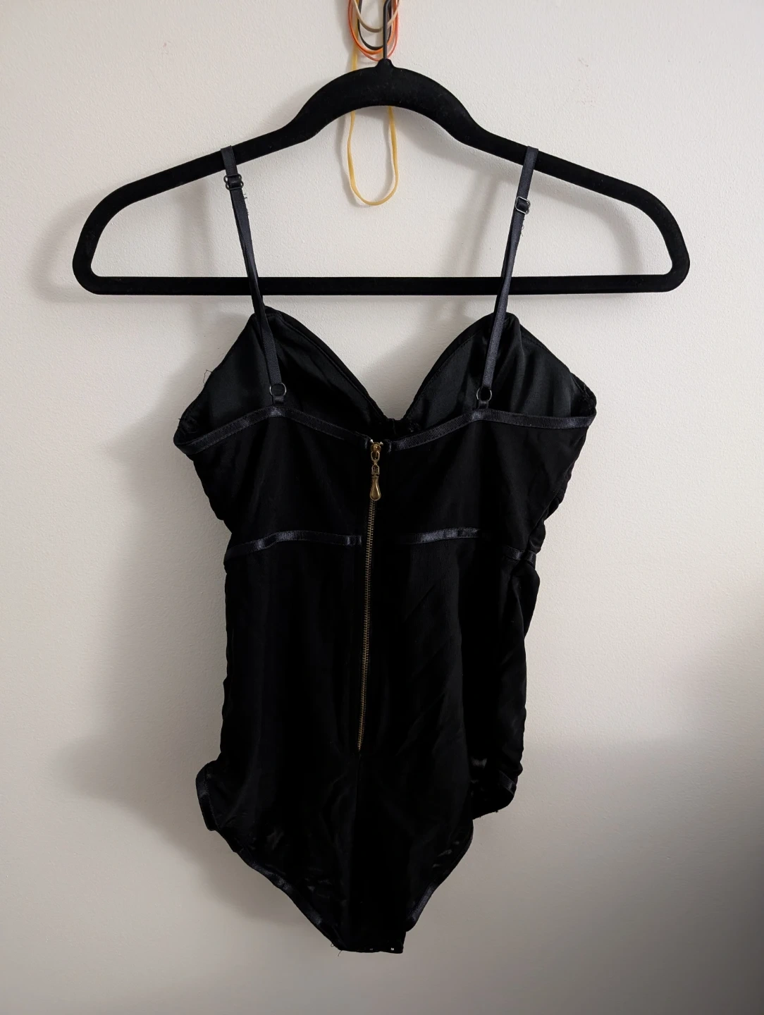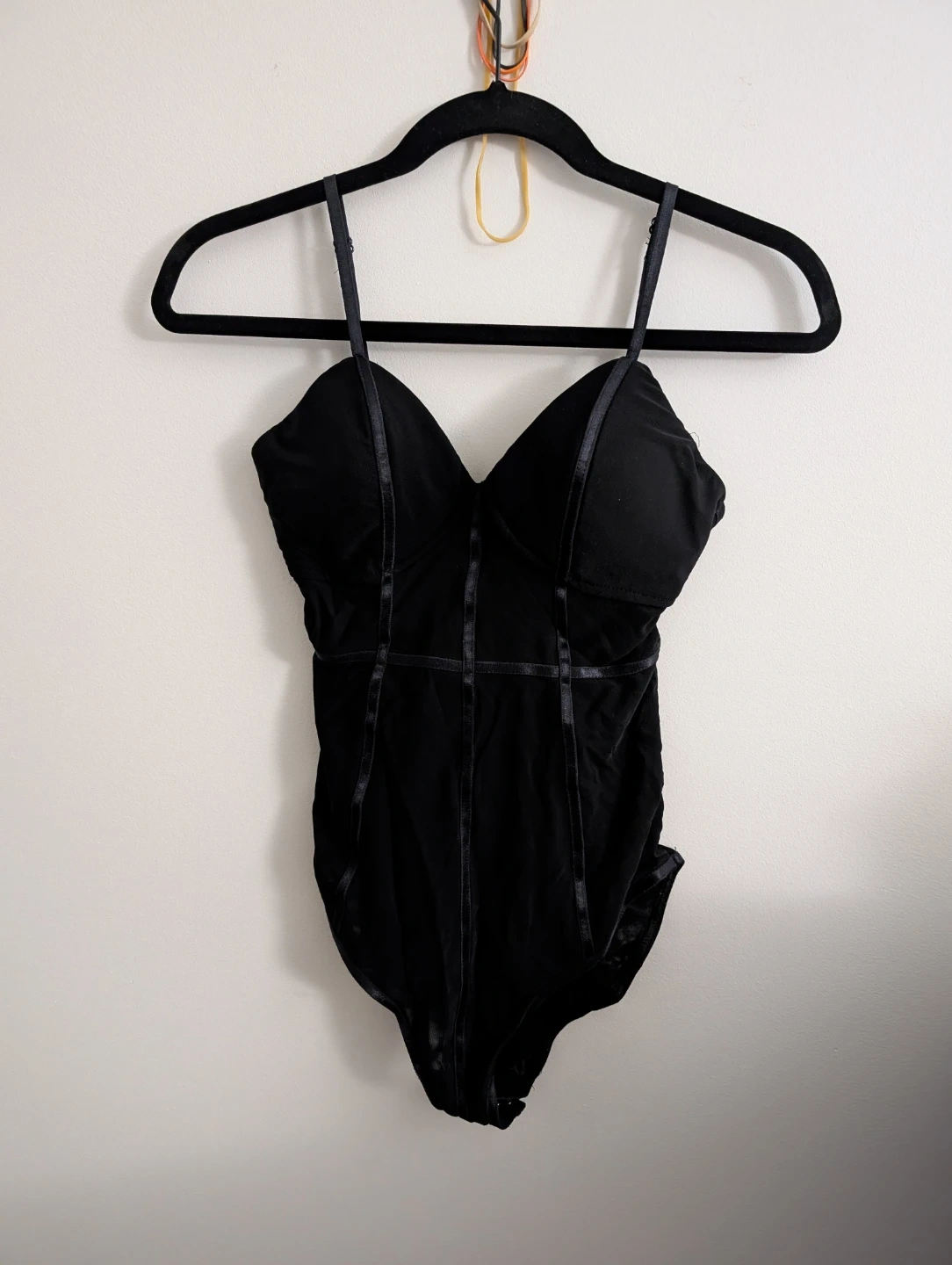 Black corset-style bodysuit with adjustable straps. Features a hook-and-eye closure in the back with a zipper. Mesh material with satin ribbon detailing.