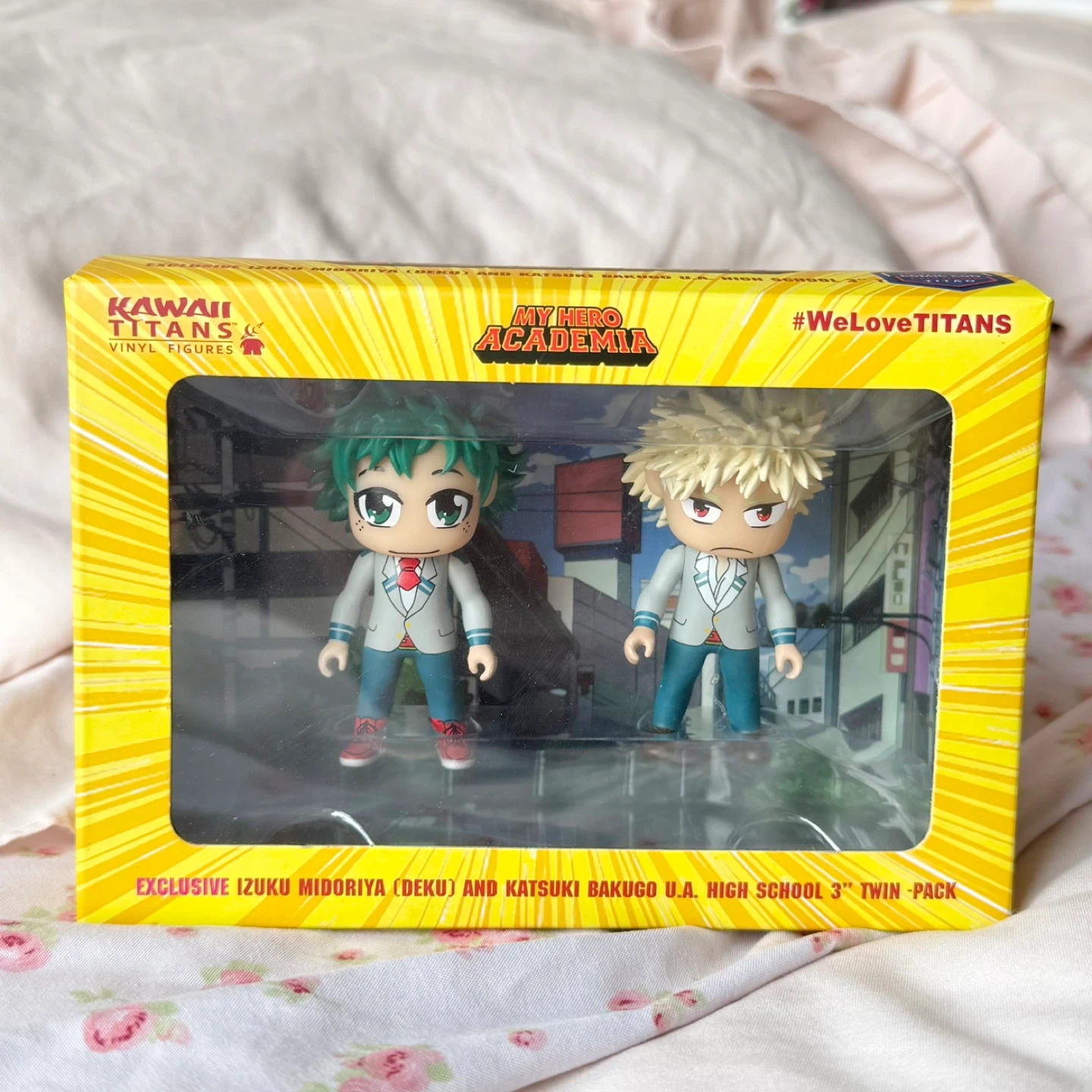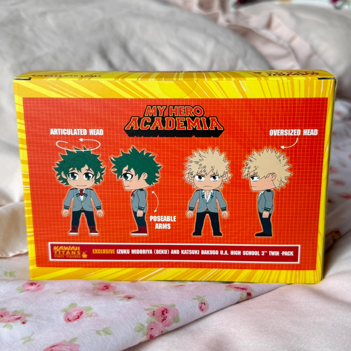This is an exclusive "Kawaii Titans" vinyl figure twin-pack featuring Izuku Midoriya (Deku) and Katsuki Bakugo from My Hero Academia. Figures are approximately 3 inches tall and show them in their U.A. High School uniforms. Both figures have articulated heads and poseable arms.
