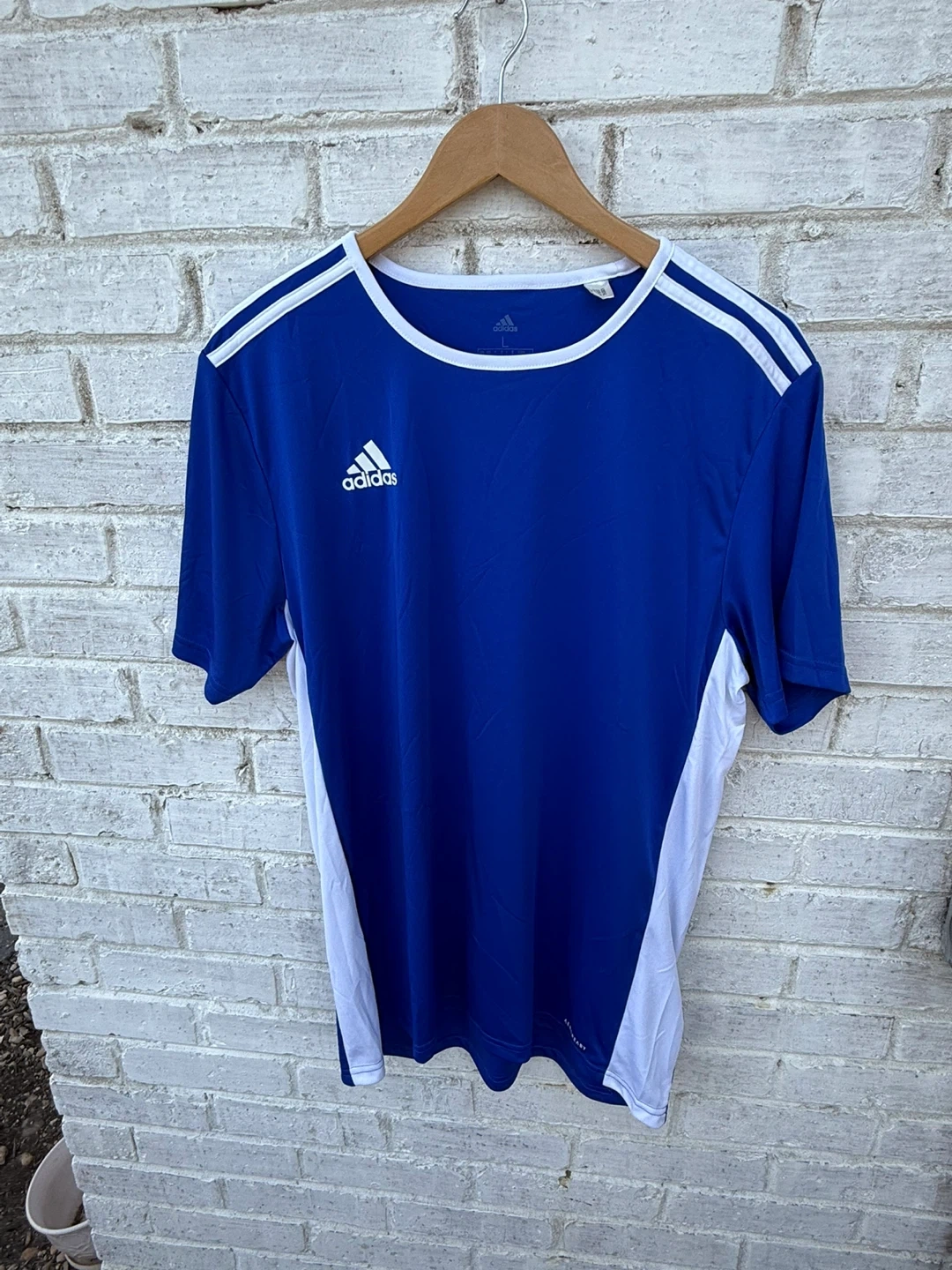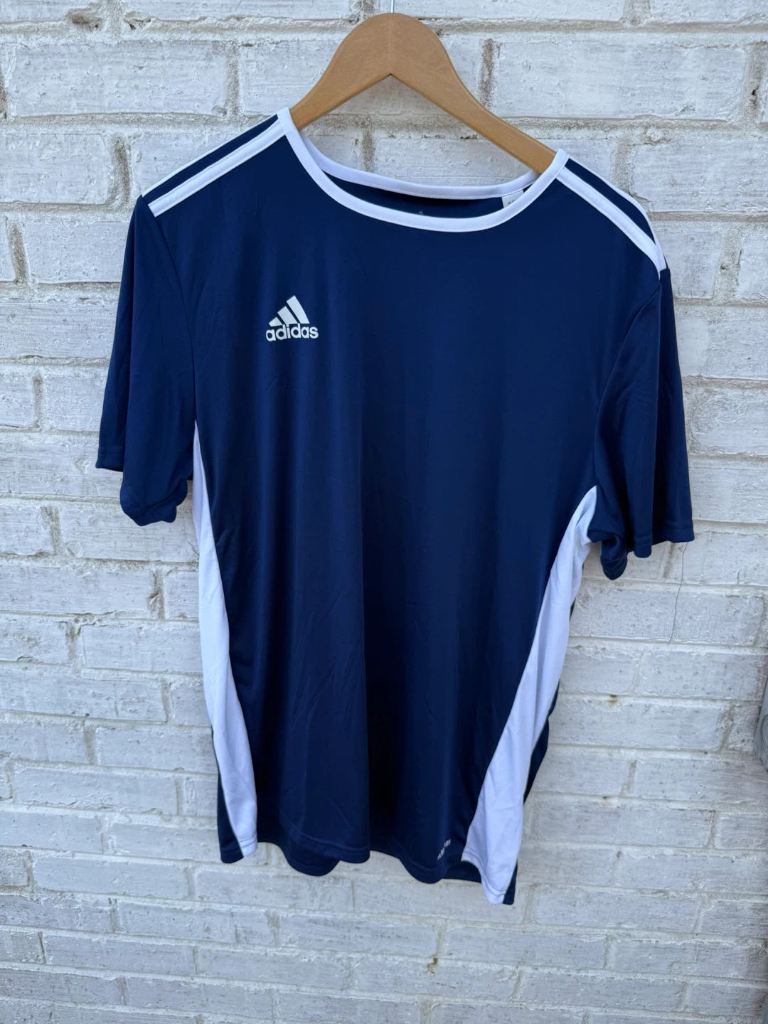 Adidas blue t-shirt with white stripes on the shoulders and sides! It's in great condition and ready for a new owner