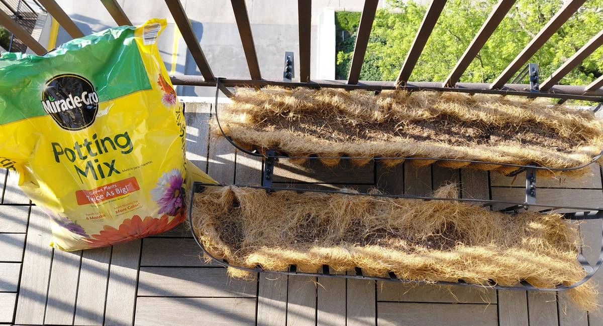 Two big metal planter boxes can be attached to a railing, filled with soil and natural fiber. Big metal planters are 36" x 7.5" x 7.5" A big bag of almost full Miracle Gro potting mix. Take all for $60