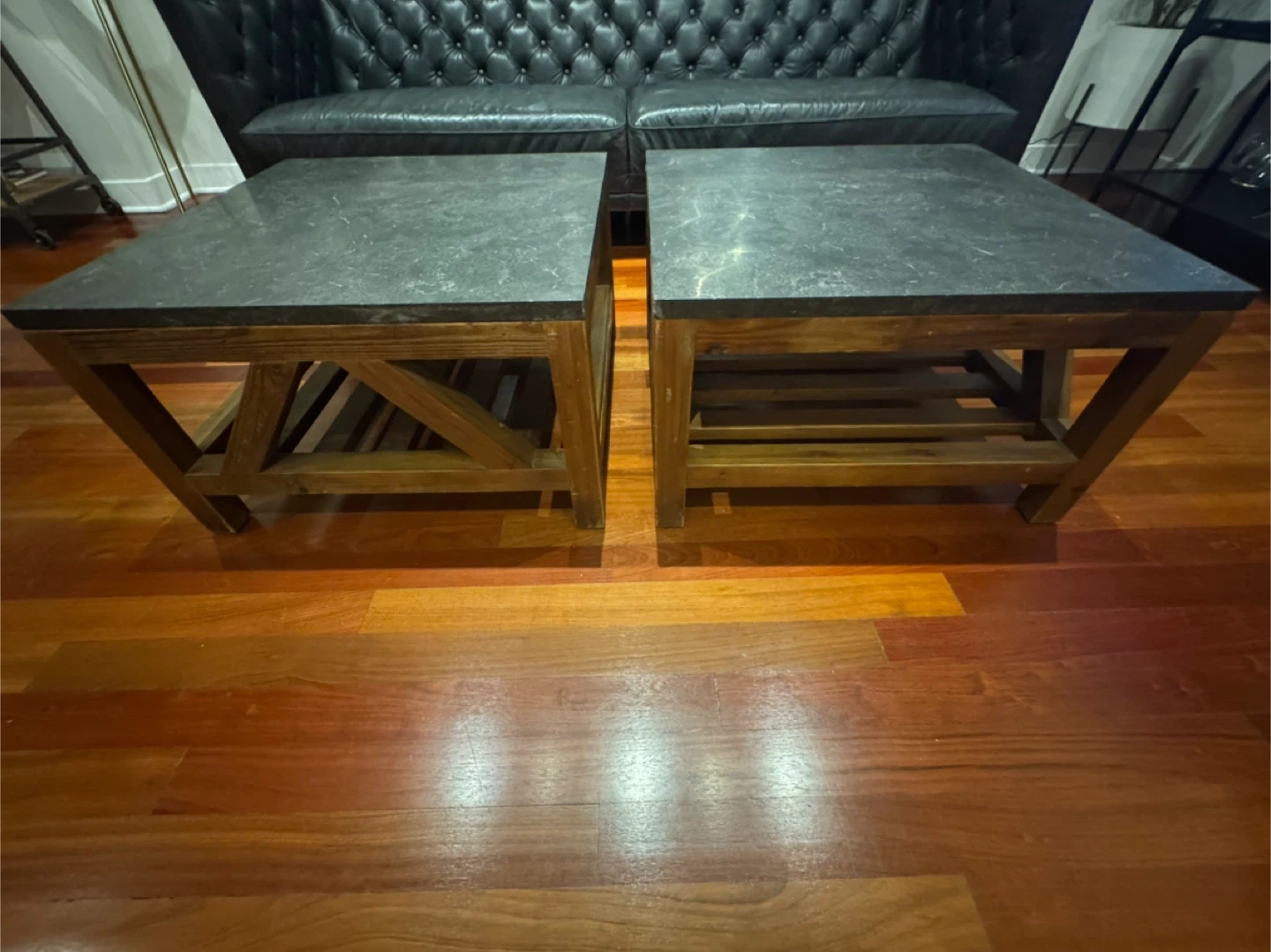 Two bluestone top 27.5” x 27.5” coffee tables (very good condition purchased around 2014 from Crate and Barrel, no longer sold at store; bluestone top heavy) priced at $350 for the 2 tables.