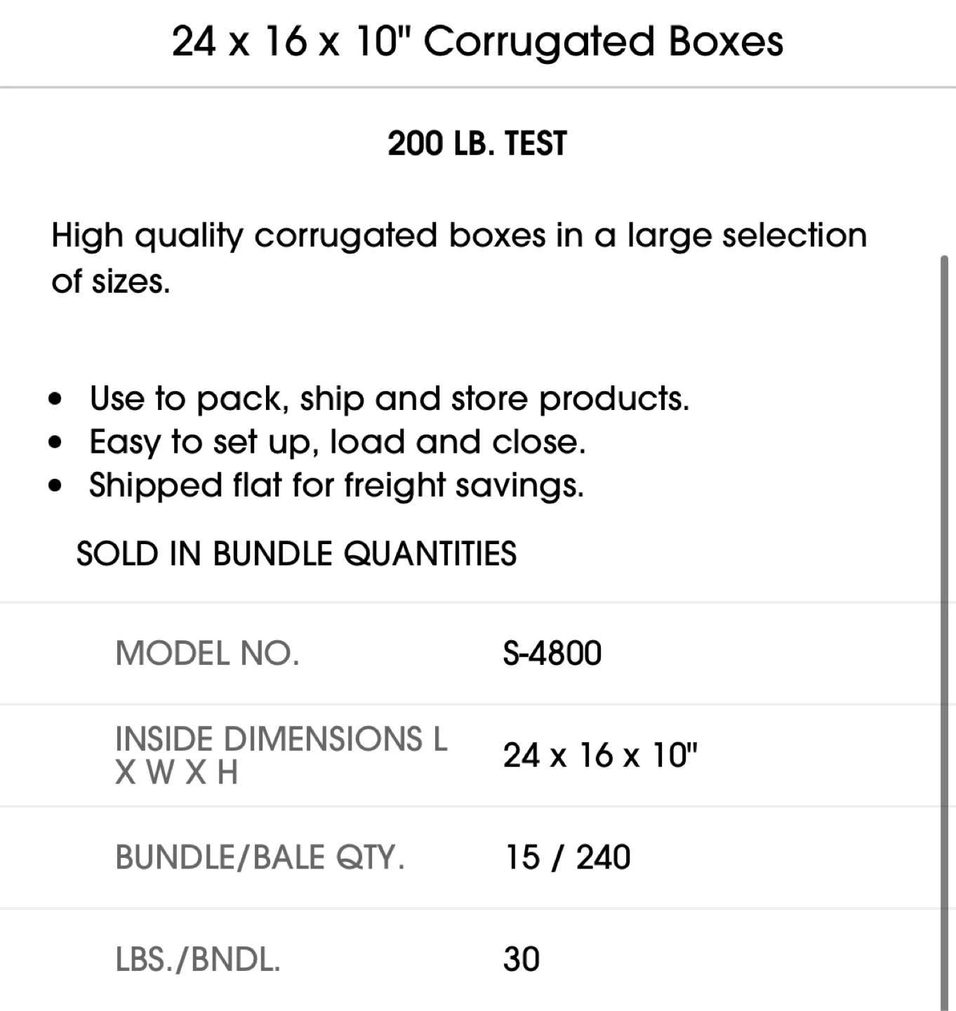 519Selling corrugated boxes with dimensions 24 x 16 x 10 inches! These high-quality boxes are great for packing, shipping, and storing products. They're easy to set up, load, and close. The model number is S-4800