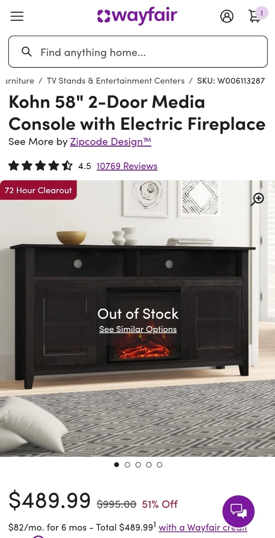 Kohn 58" 2-Door Media Console with Electric Fireplace. Weight 150 lb. Adjustable shelves. Great condition, like new. No scratches. Orinal price paid $490.