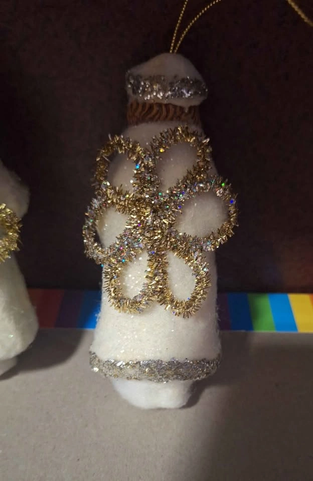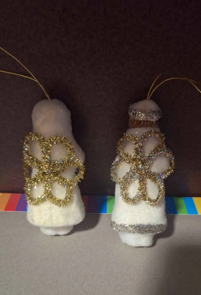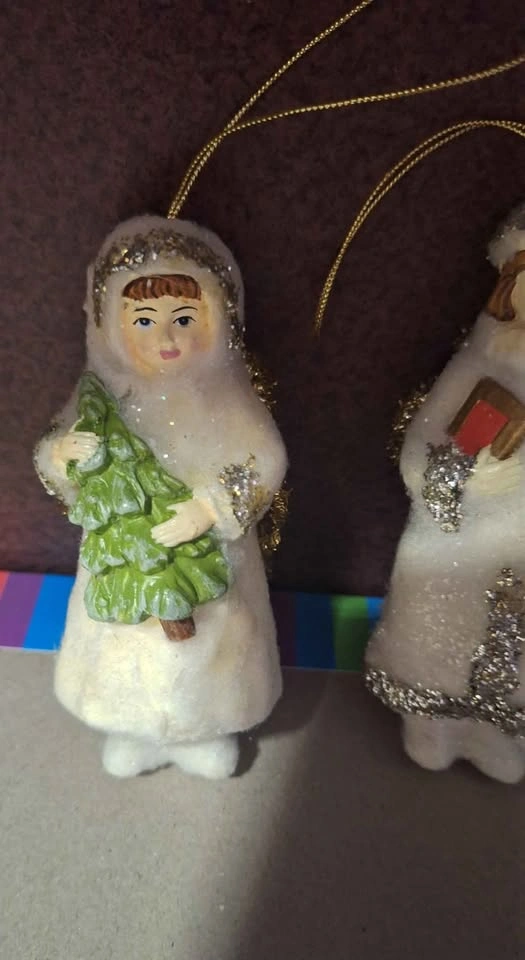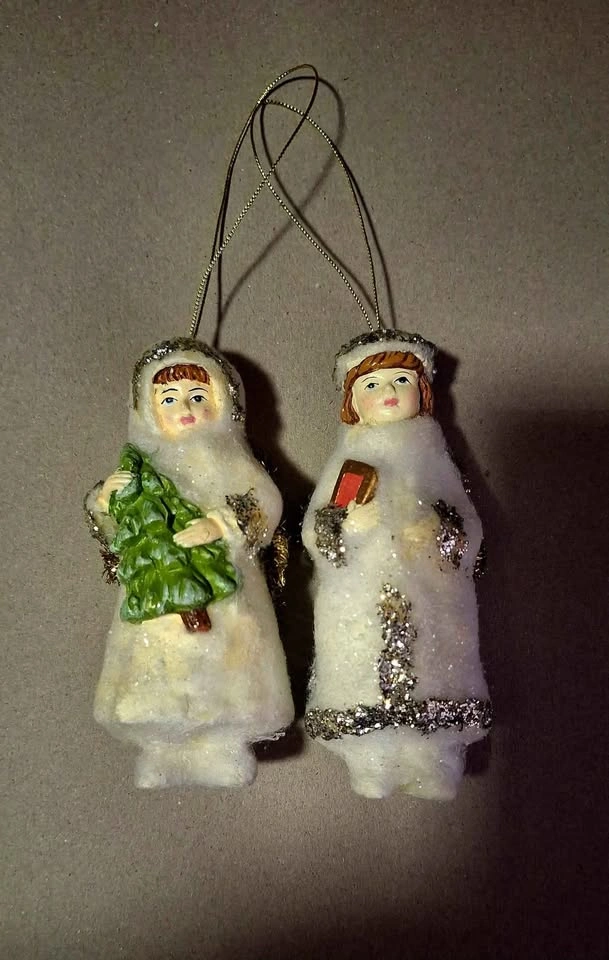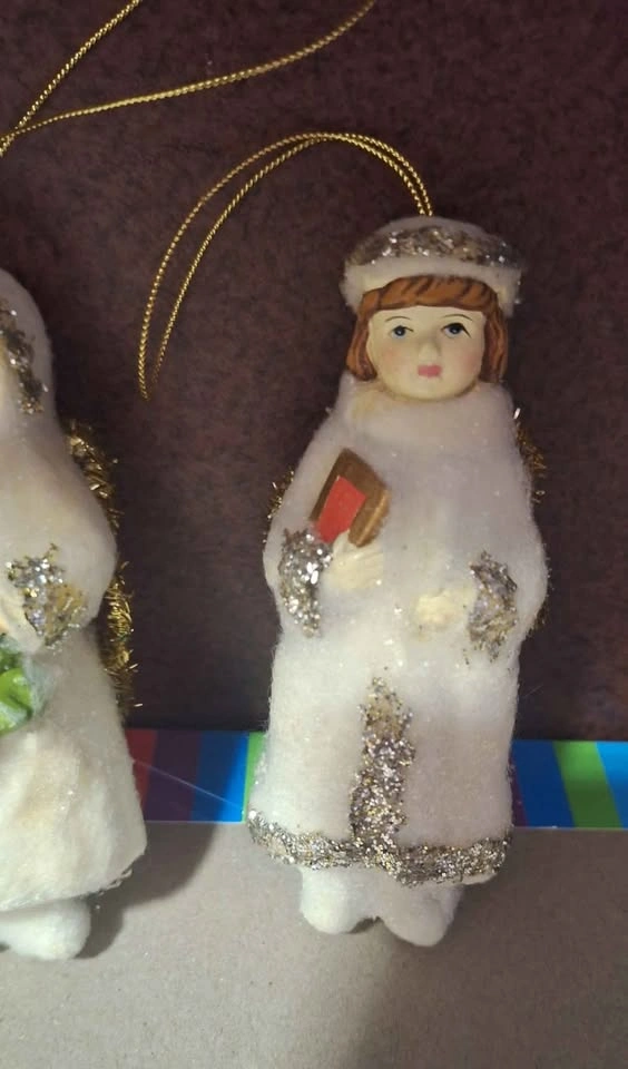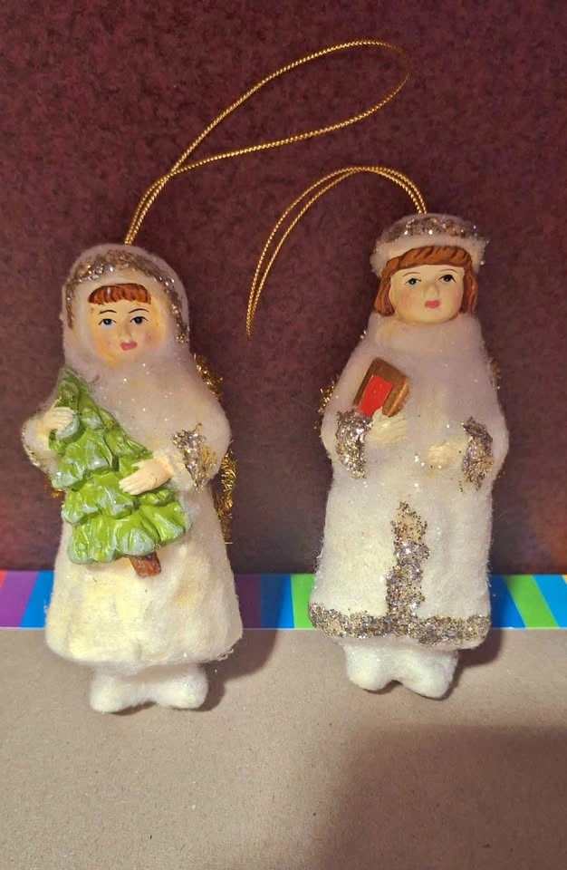 31This vintage set includes 2 medium-sized white plaster angel ornaments, each standing 4.5 inches tall and adorned with glitter. The angels are holding either a tree or a book, adding a festive touch to any Christmas decor. With a solid pattern and a classic angel theme, these ornaments are perfect for collectors or those who appreciate vintage holiday decorations.