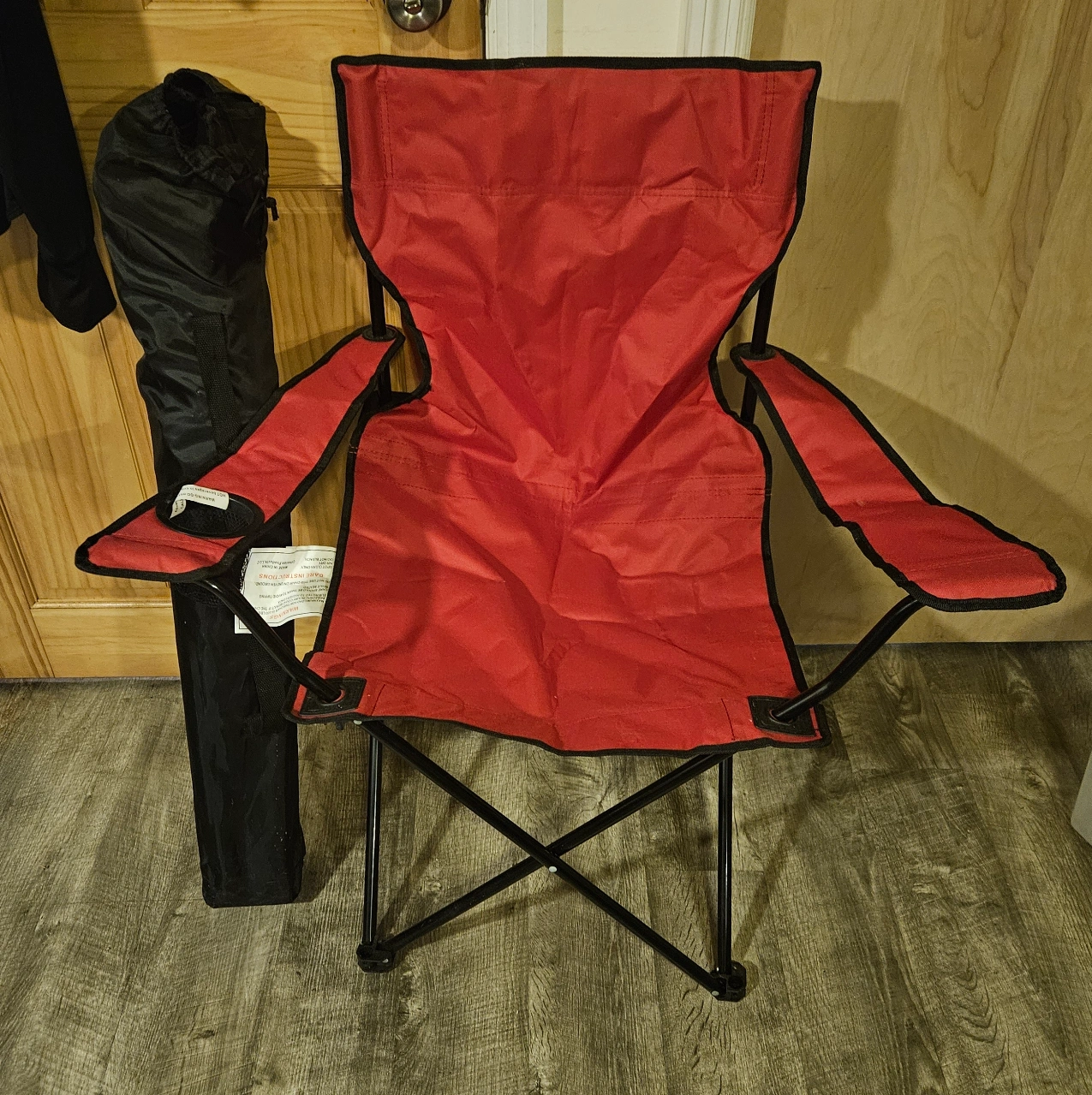 160Portable folding chair. Set of two, one red, one black. Black metal frame. Includes carry bags.