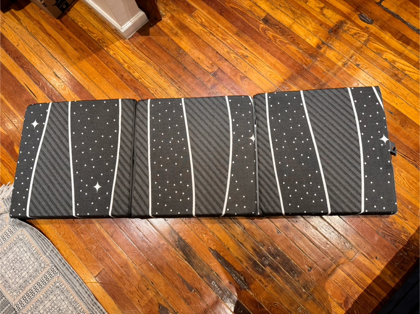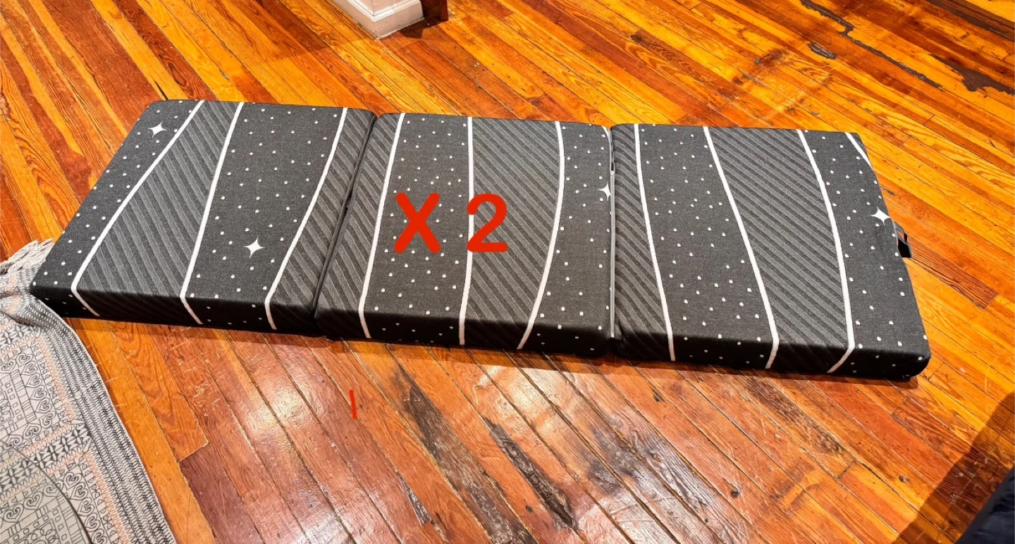 102 folding mattress, Use once , non-negotiable 25"L x 75"W x 4"Th SweetNight trifold mattress is perfect for outdoor and indoor activities. This 4-inch portable mattress is perfect for travelling, camping, college dorms, guest beds, sofa beds and many other uses. With this folding floor mattresss, whether it is for home entertainment or outdoor travel, it is perfectly adapted to meet your diverse needs. One : 50$ Two : 100$