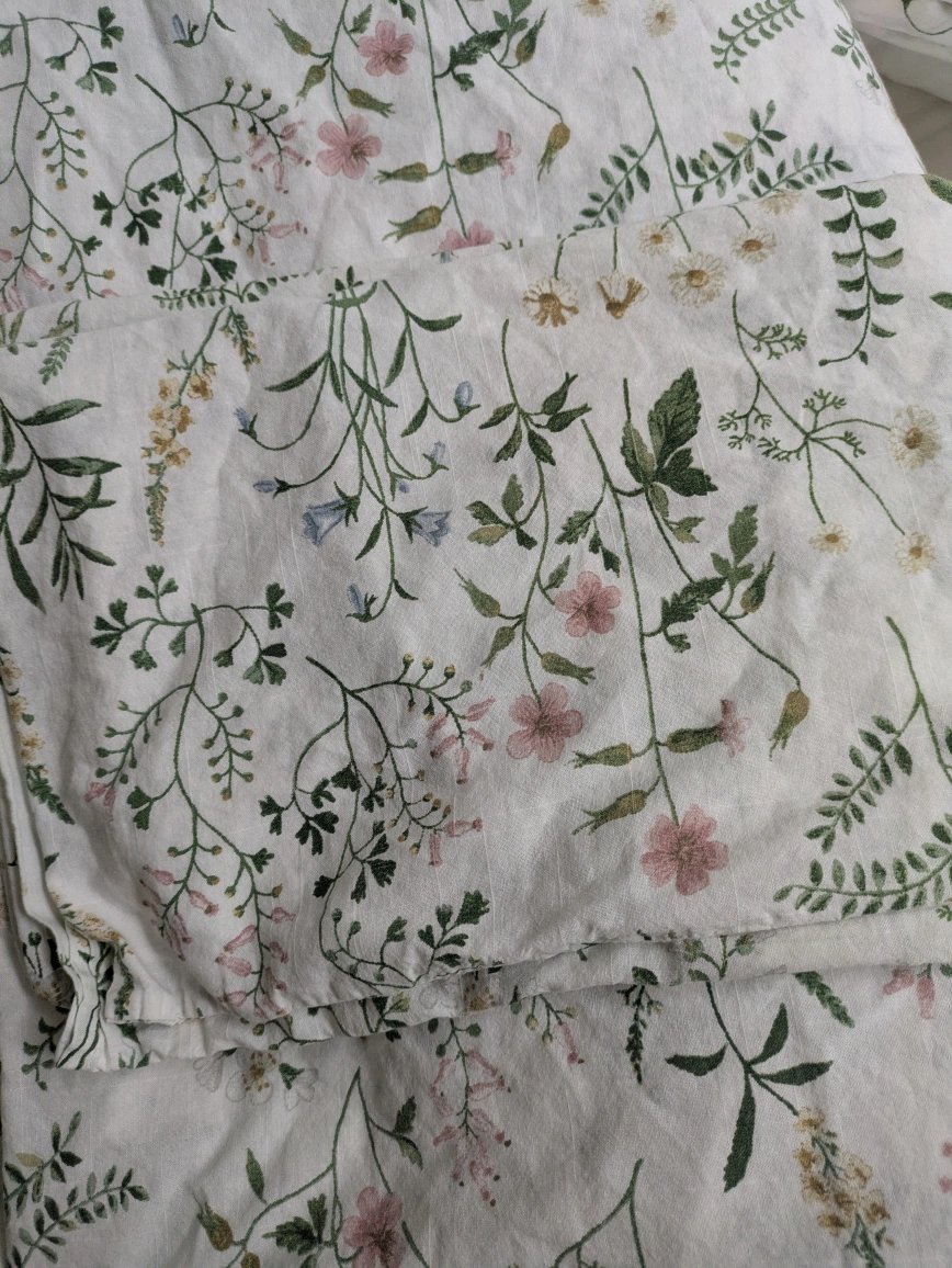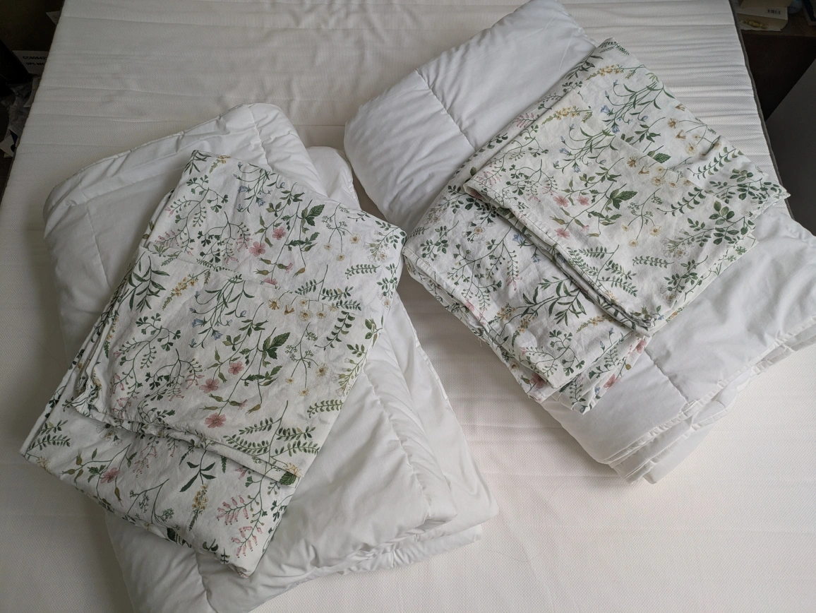 Selling 2 gently used IKEA TIMJANSMOTT duvet cover and pillowcase sets. They are CLEAN and don't have any stains. Original price $50. Also have 2 SMÅSPORRE duvet inserts, warm, twin, 2 NATTJASMIN white fitted sheets for queen size bed and LUDDROS mattress protector for queen size bed. Selling because of relocating. We need to get rid of a lot of stuff in the next few weeks so please check out my other listings 😊. More coming soon!