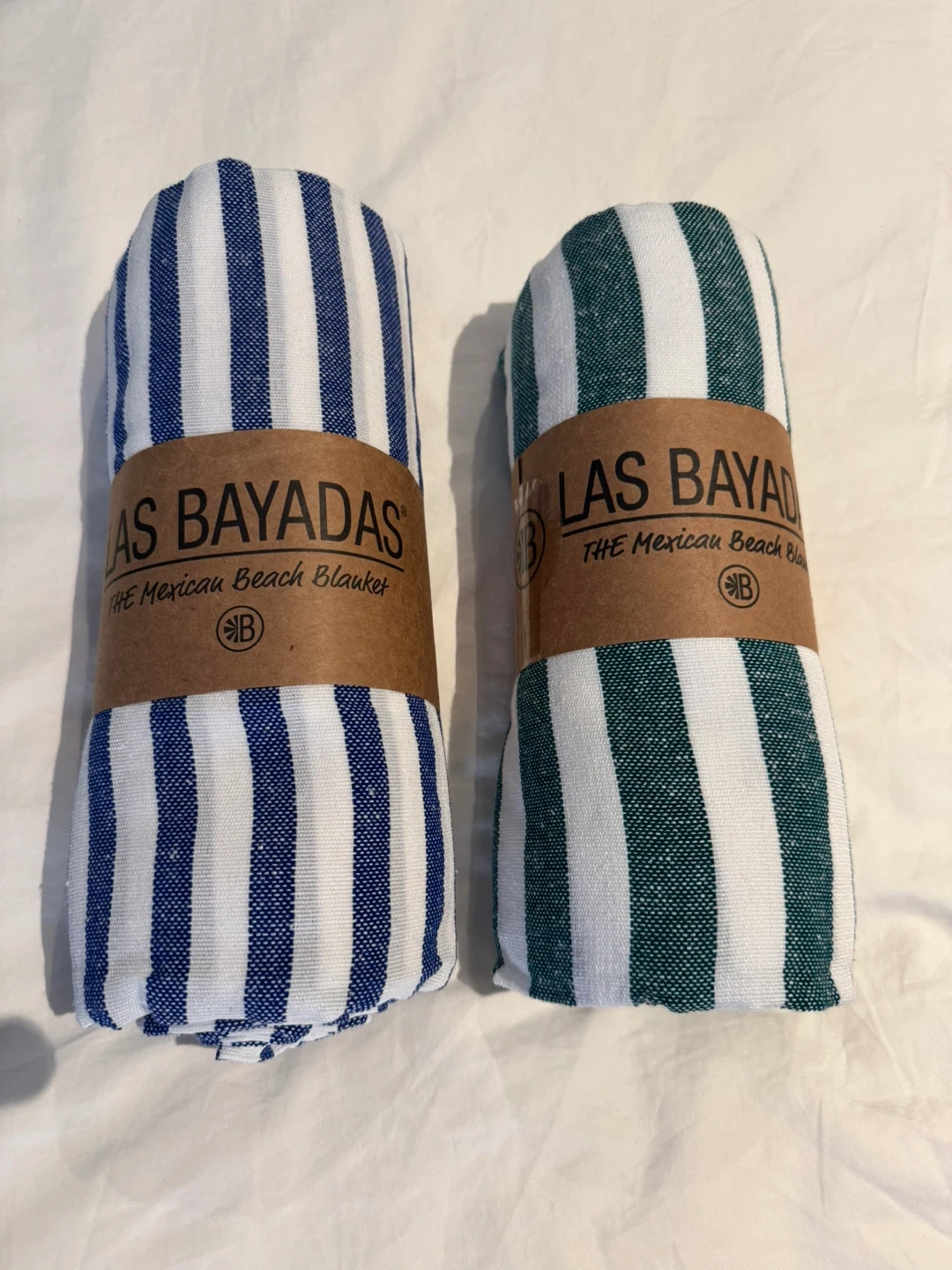 These are Las Bayadas Mexican beach blankets. They're perfect for the beach, pool, or even as a throw blanket. One is blue and white striped, and the other is green and white striped. They are in great condition!