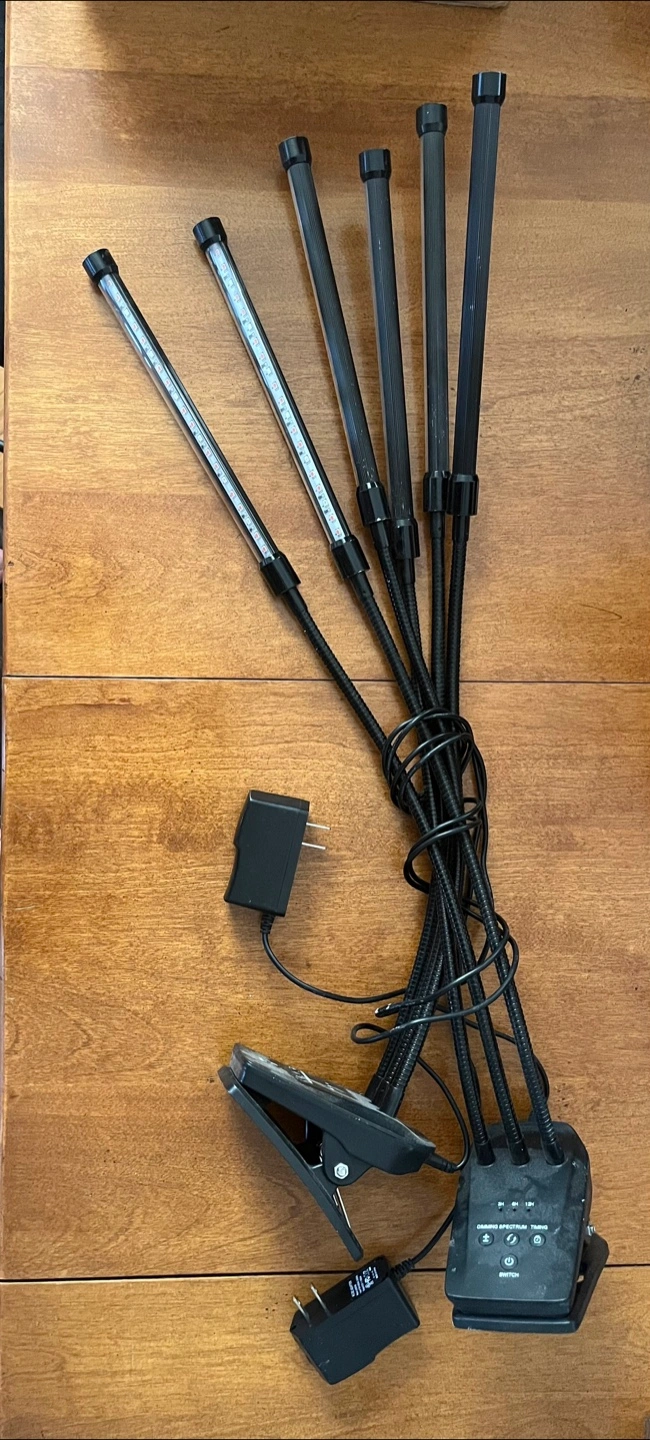 Selling two used LED grow light with a clamp. They feature multiple flexible gooseneck lamps for directing light where needed. The control panel allows for spectrum and timing adjustments. Comes with the power adapter as shown in the picture.