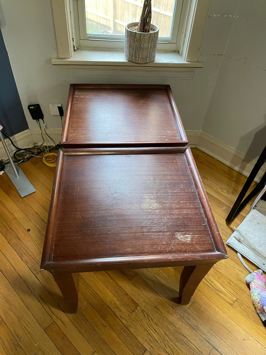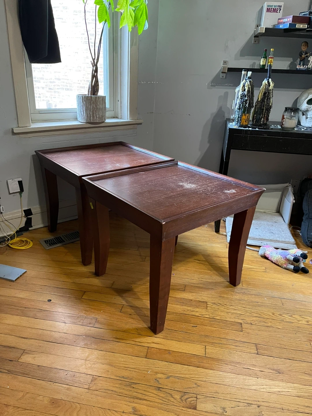 84Wooden Side tables (2 available) $40 for both / or $25 each Each table measures: 26" Wide X 24" Long X 22" Tall Very light scuffing/standard wear on tabletops as seen in the pics. Downsizing for a big out of state move and these wood side tables are looking for a new living space to call home.